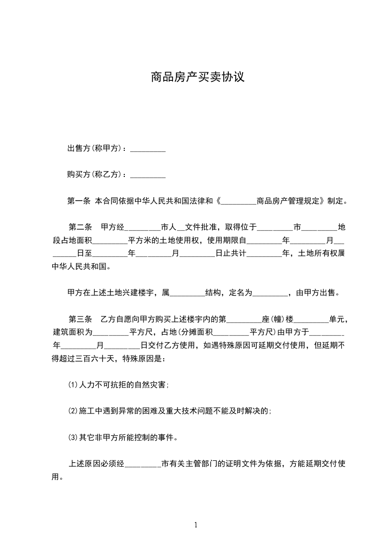 第三条 乙方自愿向甲方购买上述楼宇内的第 座(幢)楼 单元,建筑面积为 平方尺,占地(分摊面积 平方尺)由甲方于 年 月日交付乙方使用,如遇特殊原因可延期交付使用,但延期不得超过三百六十天,特殊原因是:
