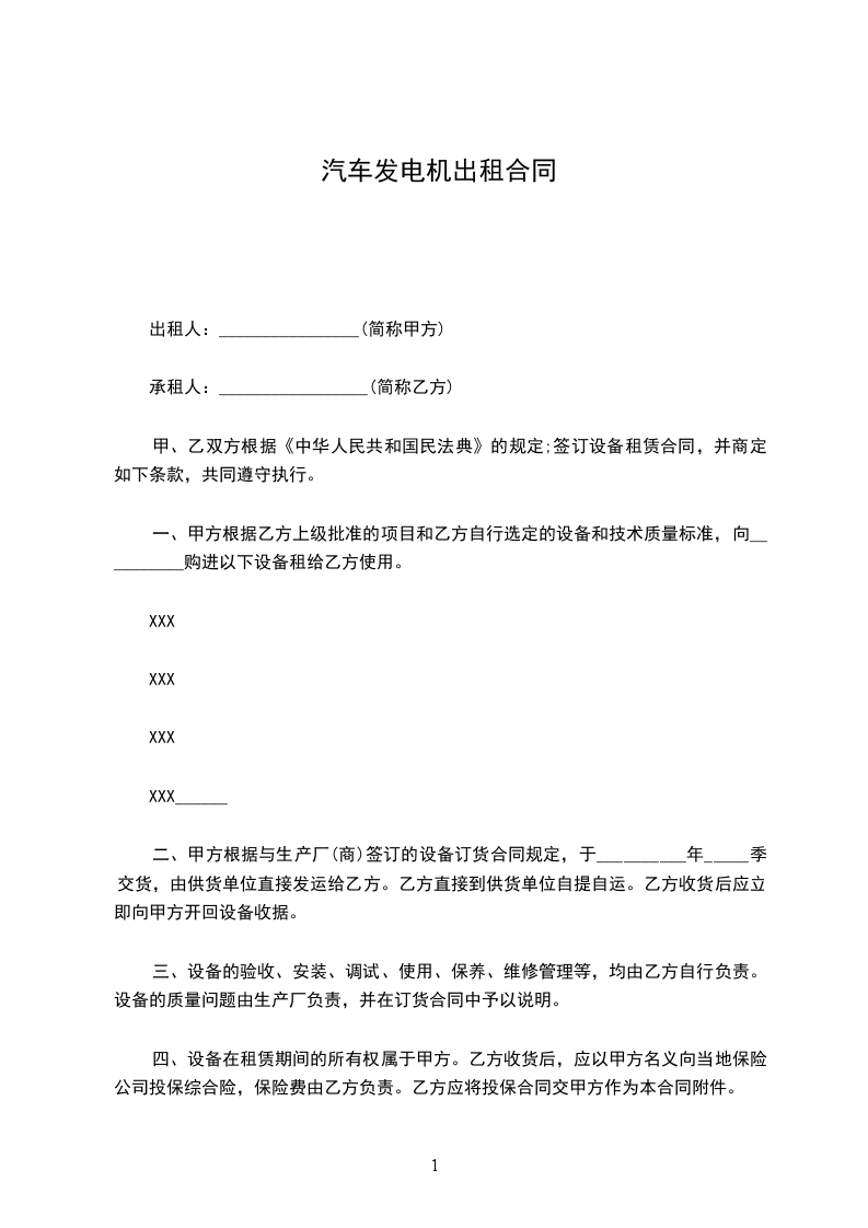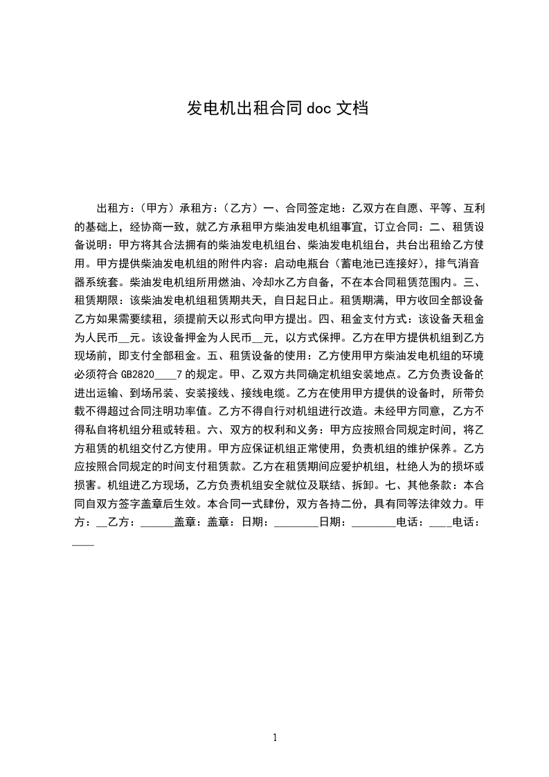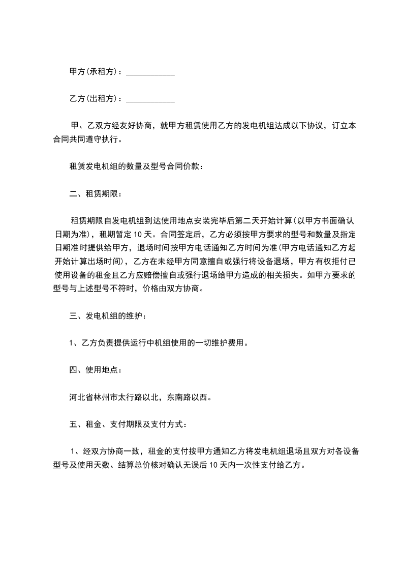 乙双方在自愿、平等、互利的基础上,经协商一致,就乙方承租甲方柴油发电机组事宜,订立合同: