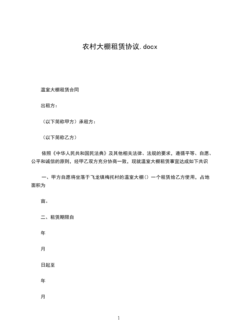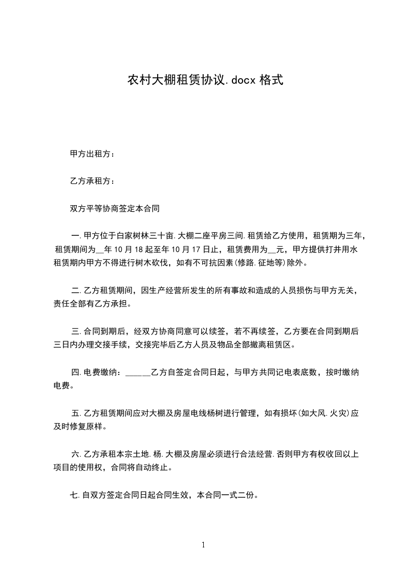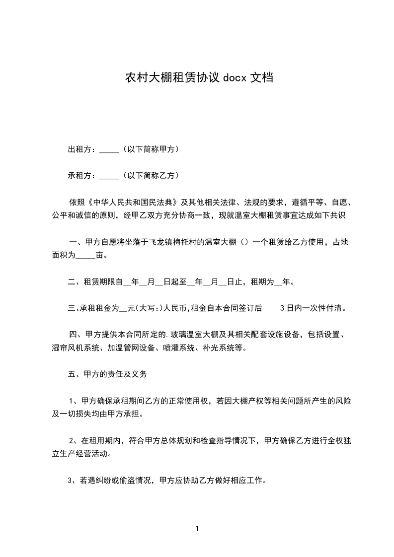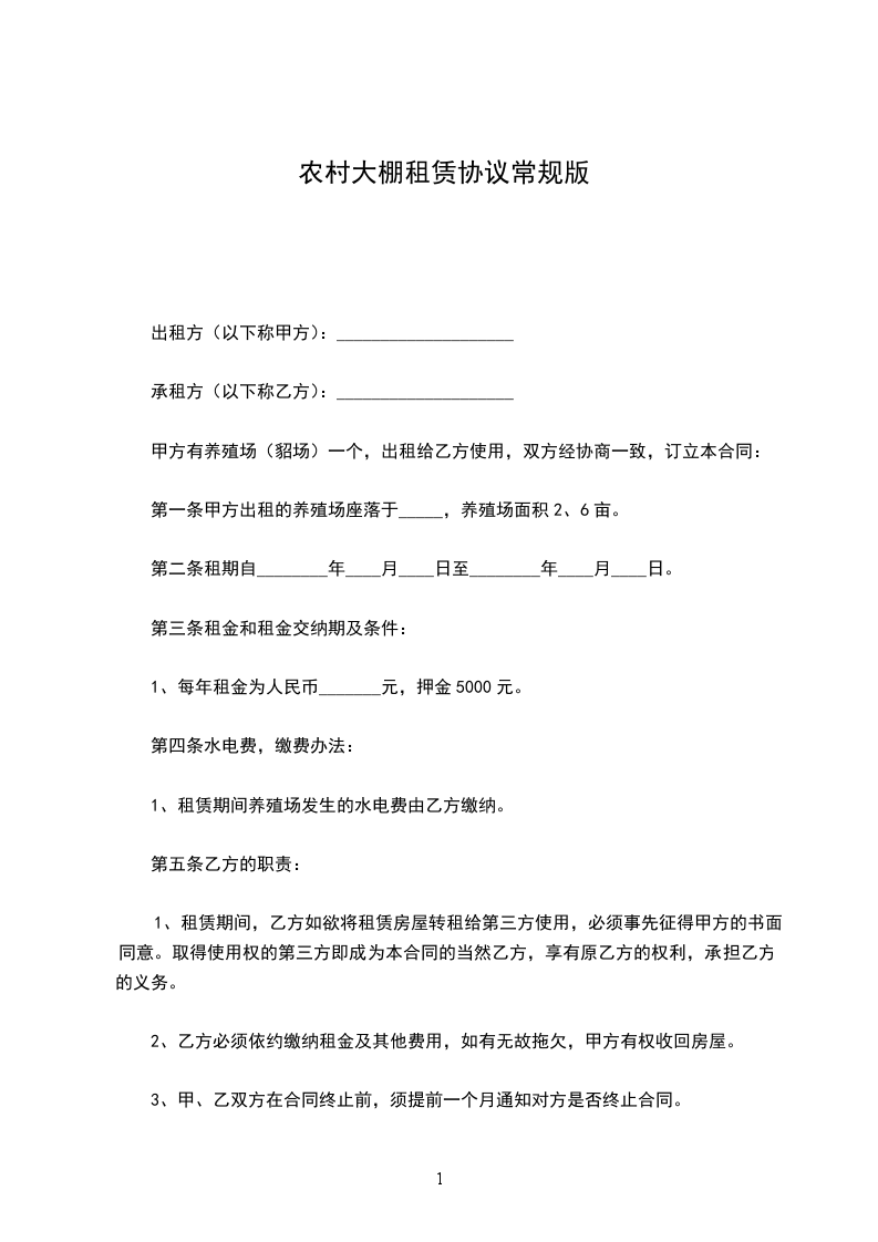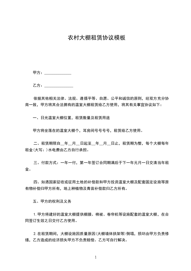 5、乙方按照租赁合同中约定的付款金额和日期付给甲方租金,一旦乙方不按时支付租金,甲方有权收回大棚终止合同。