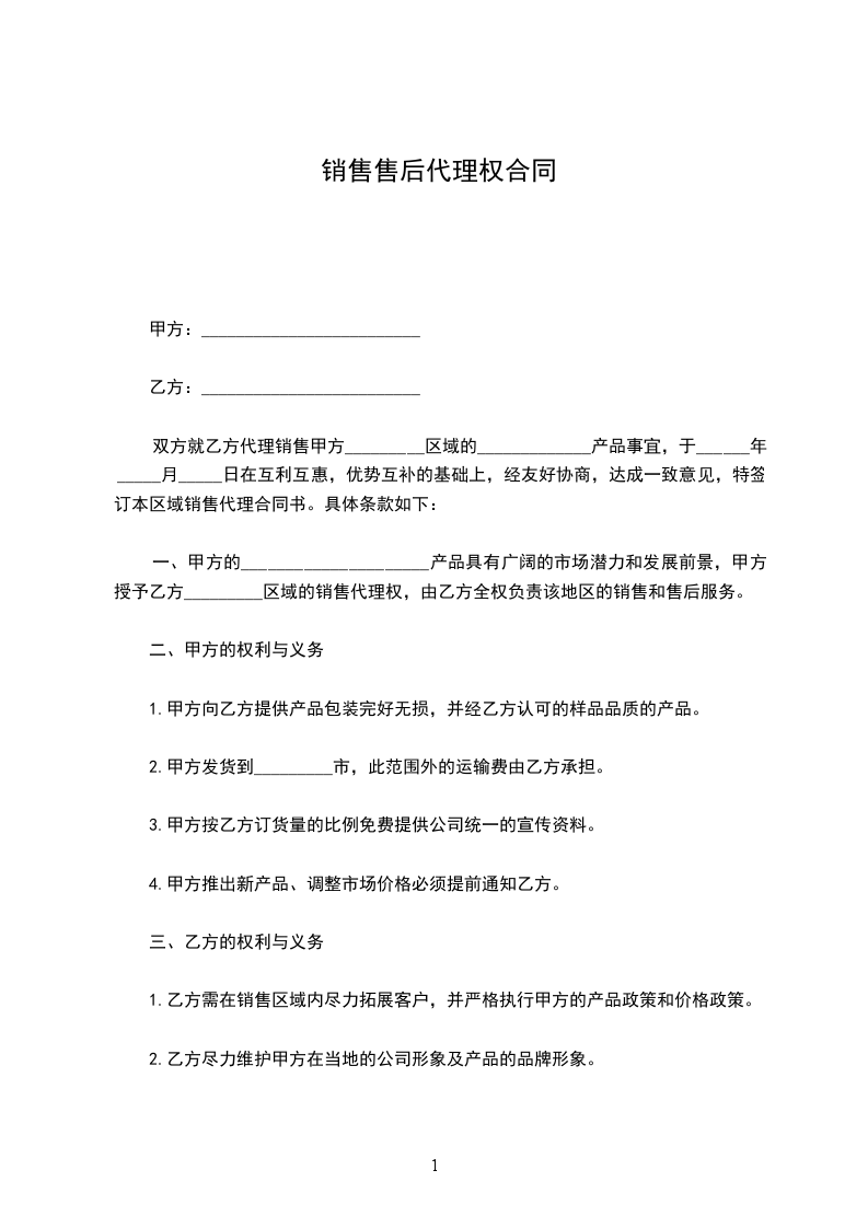 一、甲方的_____________________产品具有广阔的市场潜力和发展前景,甲方授予乙方_________区域的销售代理权,由乙方全权负责该地区的销售和售后服务。
