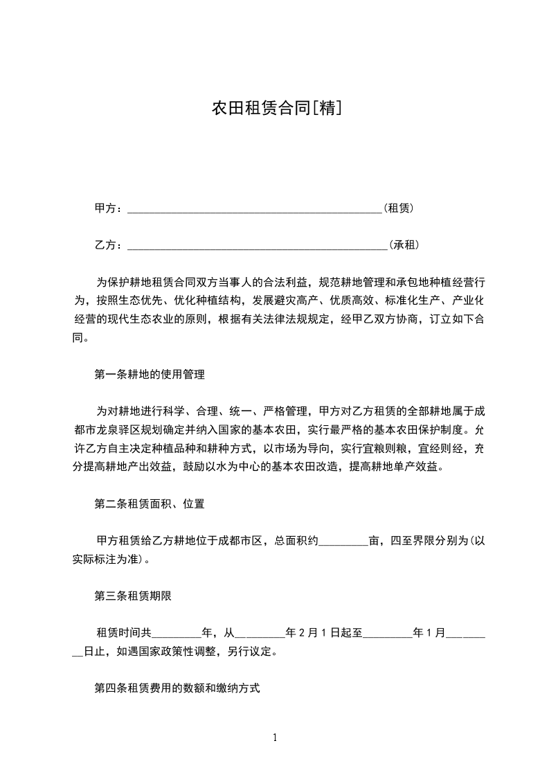 为保护耕地租赁合同双方当事人的合法利益,规范耕地管理和承包地种植经营行为,按照生态优先、优化种植结构,发展避灾高产、优质高效、标准化生产、产业化经营的现代生态农业的原则,根据有关法律法规规定,经甲乙双方协商,订立如下合同。