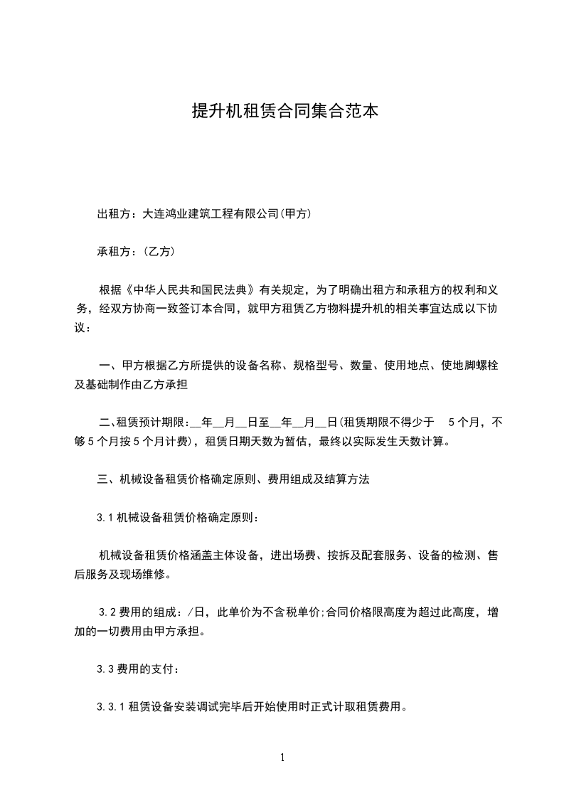 一、租期:___个月起,工地完工未满___个月算___个月,超过时间按天计算租金,机械安装调试并经安监站检测验收合格后甲方预付三台提升机押金___元整。报装、报验,挂靠公司费___元台,报拆费、挂靠公司费___元台。安装人工费___元米,拆除人工费___元米,超过___米,二次加节补___元次台。