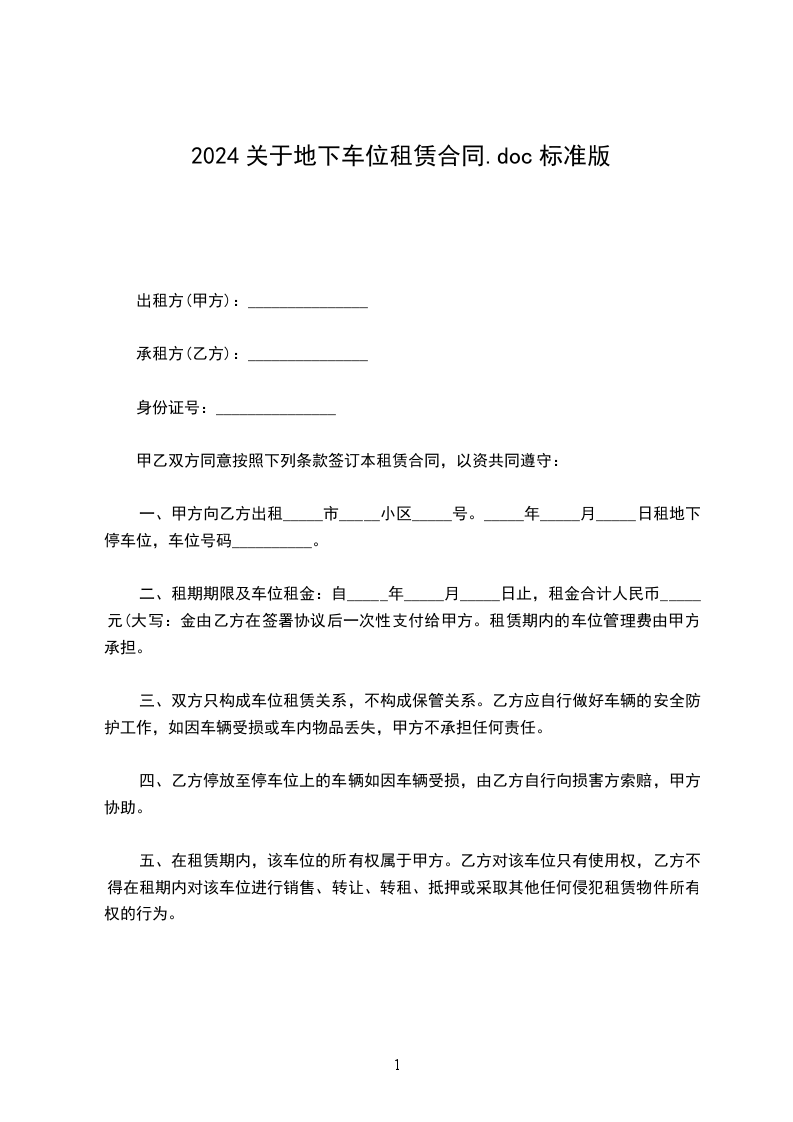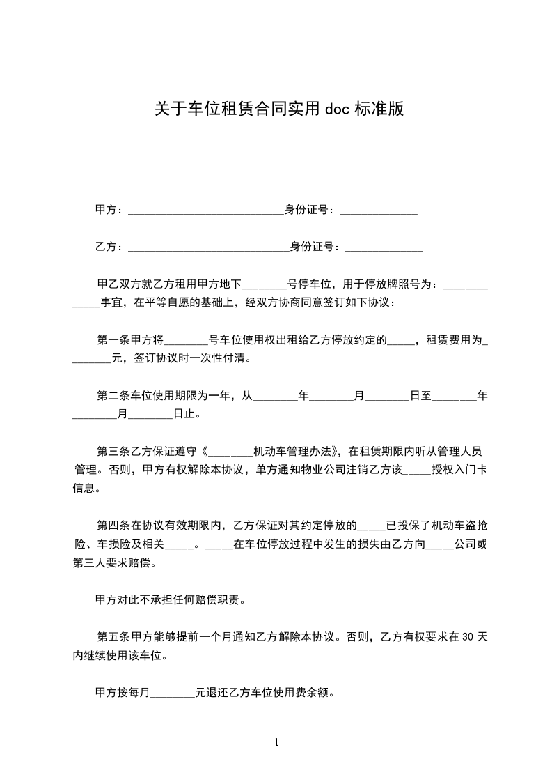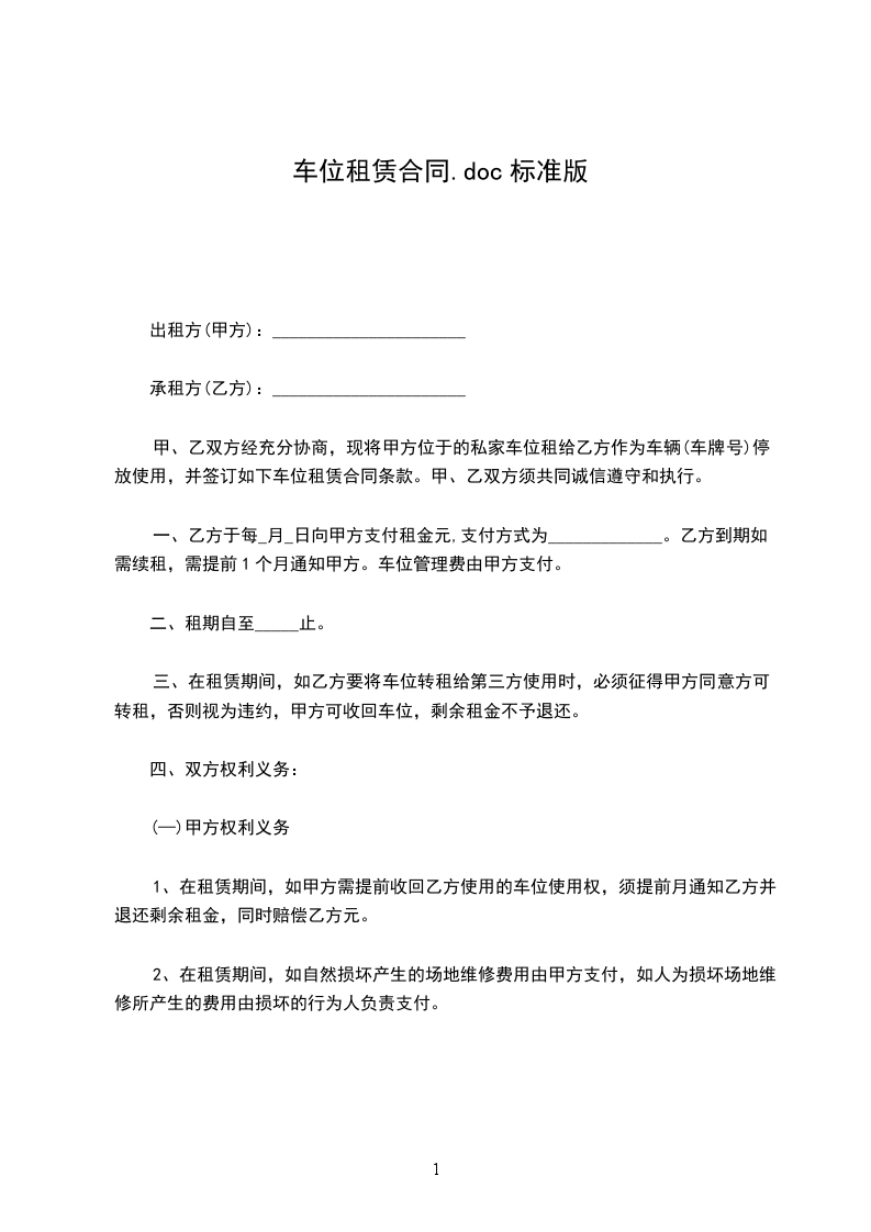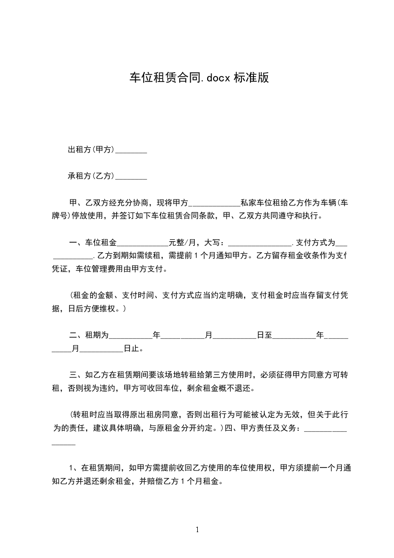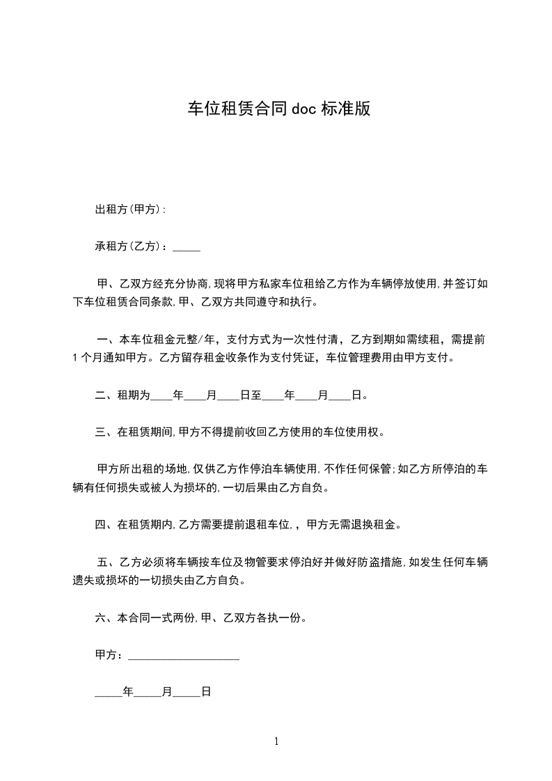 一、本车位租金元整/年,支付方式为一次性付清,乙方到期如需续租,需提前1个月通知甲方。乙方留存租金收条作为支付凭证,车位管理费用由甲方支付。
