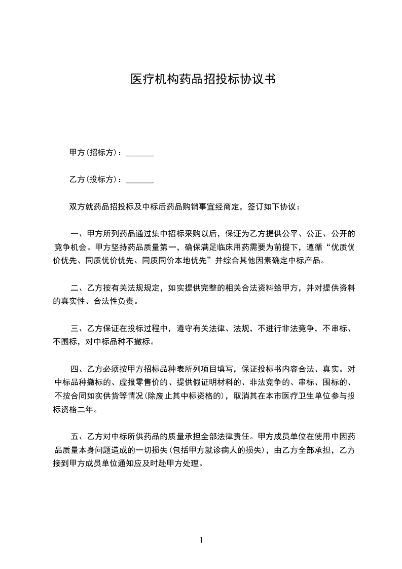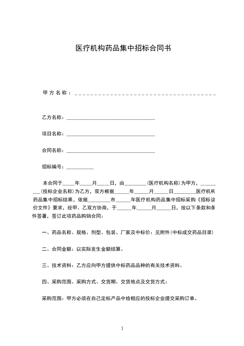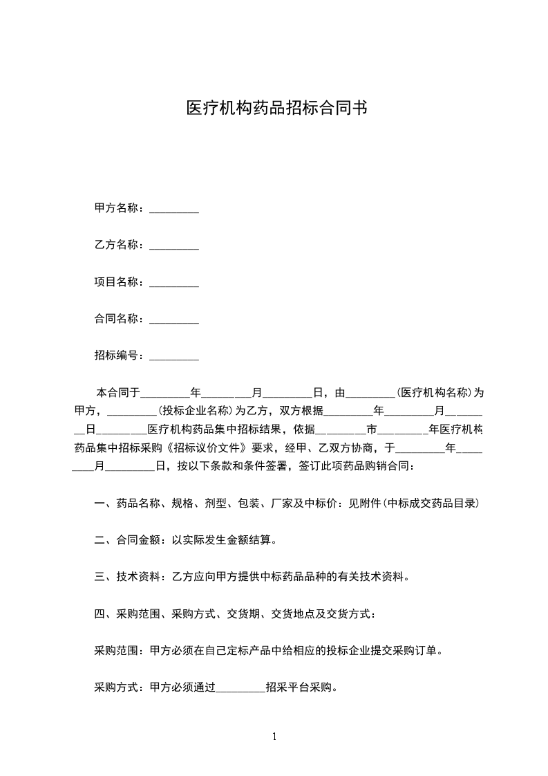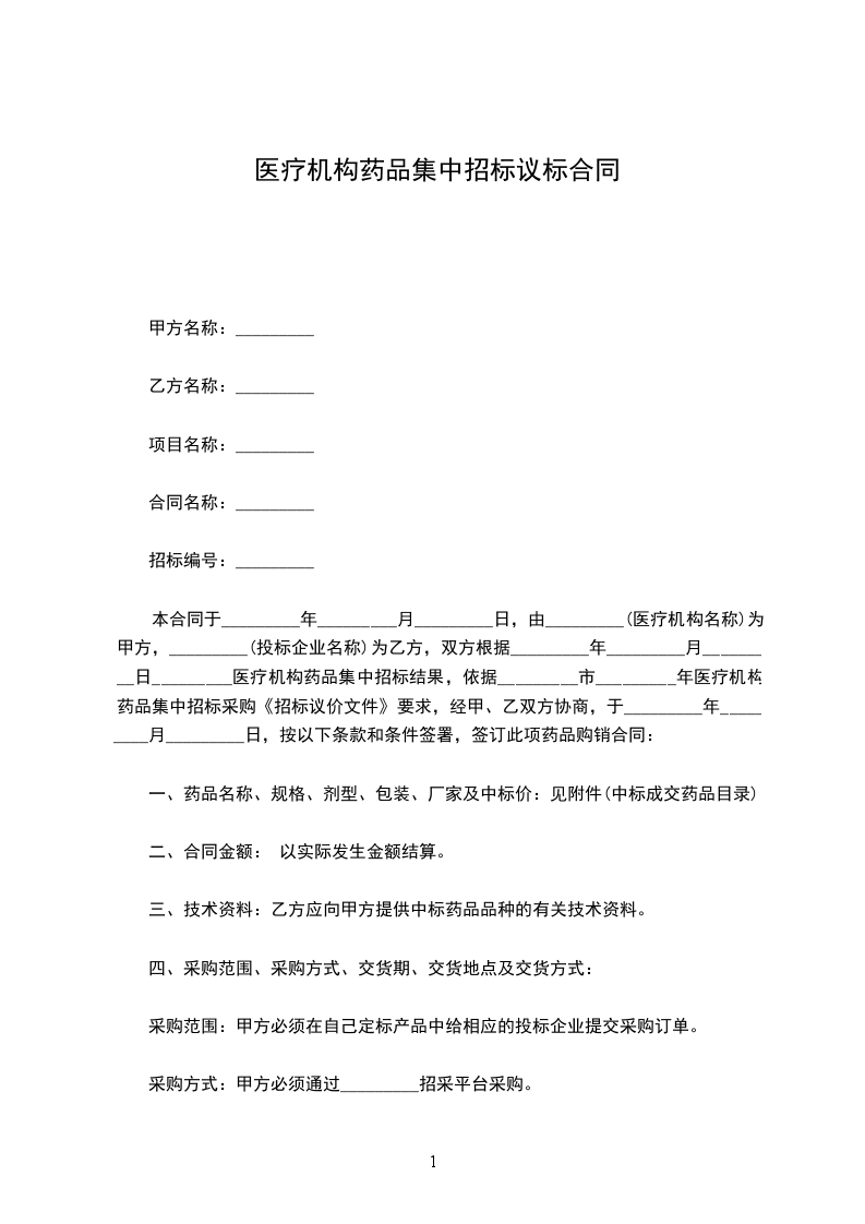 本合同于_________年_________月_________日,由_________(医疗机构名称)为甲方,_________(投标企业名称)为乙方,双方根据_________年_________月_________日_________医疗机构药品集中招标结果,依据_________市_________年医疗机构药品集中招标采购《招标议价文件》要求,经甲、乙双方协商,于_________年_________月_________日,按以下条款和条件签署,签订此项药品购销合同: