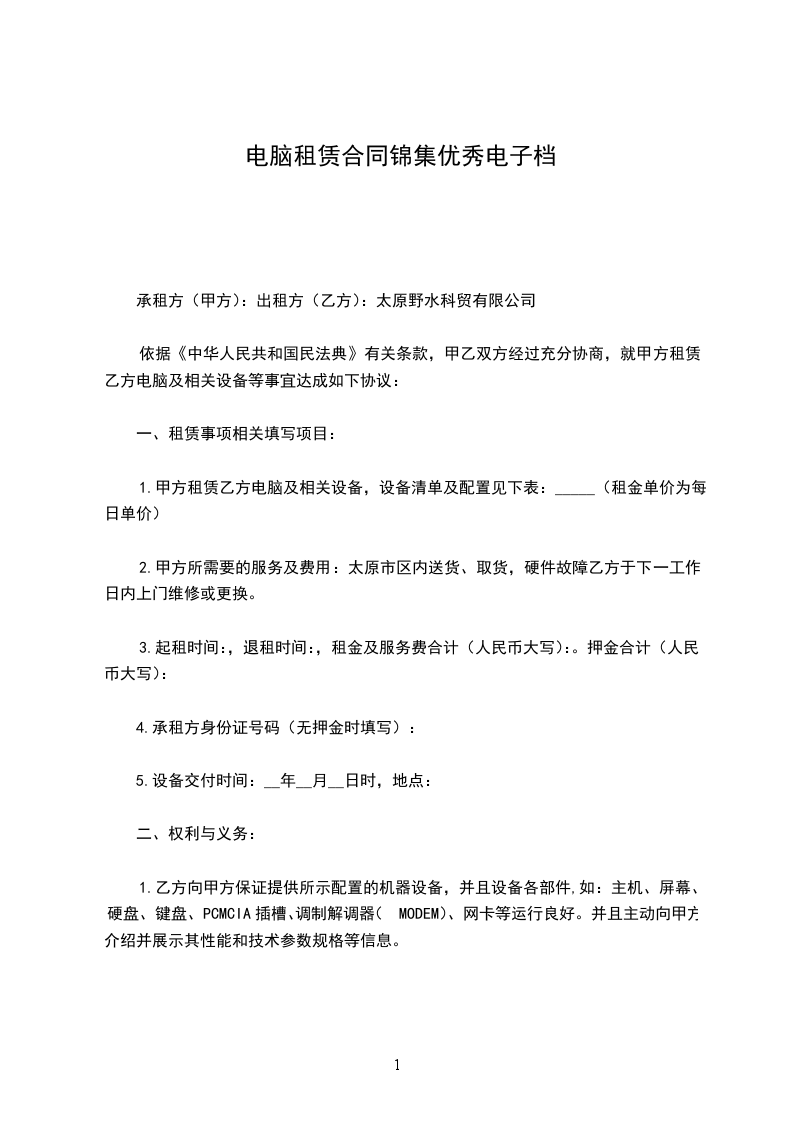 依据《中华人民共和国民法典》有关条款,甲乙双方经过充分协商,就甲方租赁乙方电脑及相关设备等事宜达成如下协议: