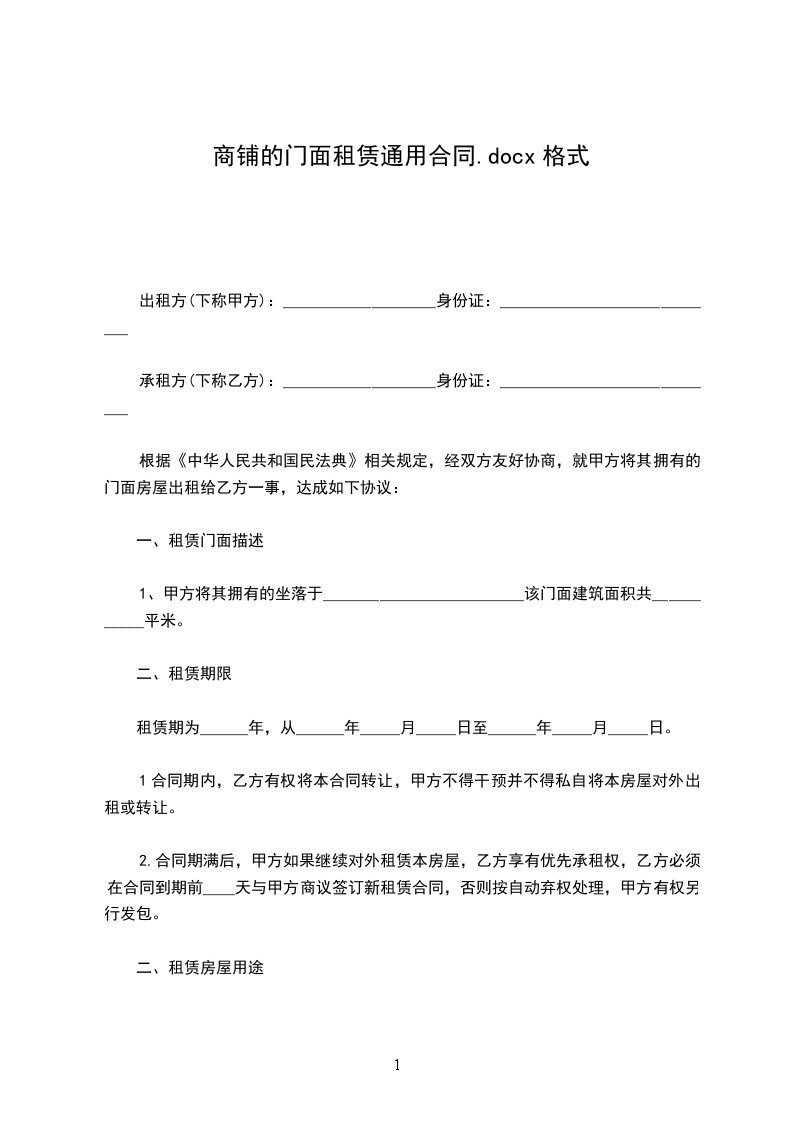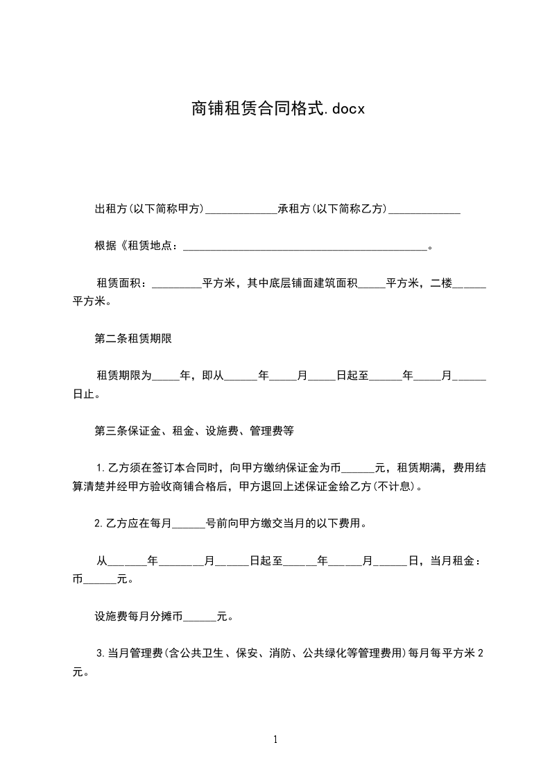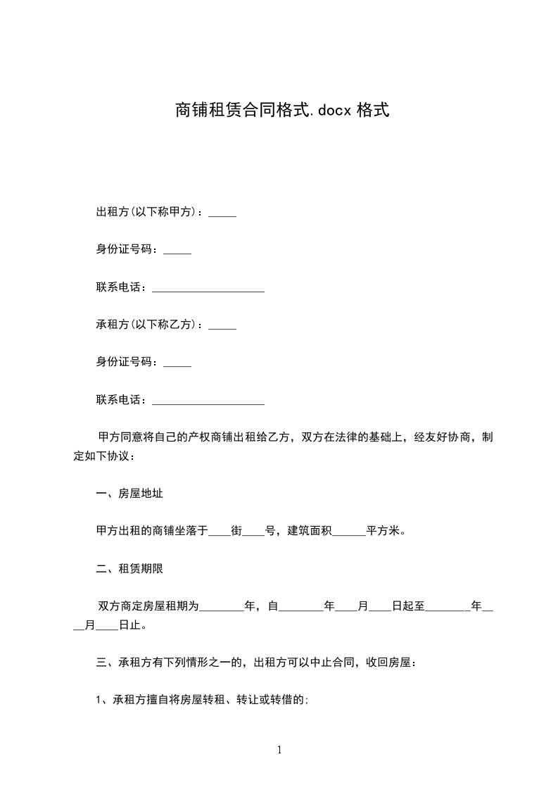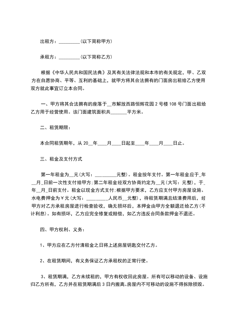 一、甲方将位于新大洲大道430号铺面出租给乙方,租期为伍年(从20__年10月1日至20__年9月30日止),在此期间,任何一方如要求终止合同,提出方须赔偿对方20__元人民币作为违约金。