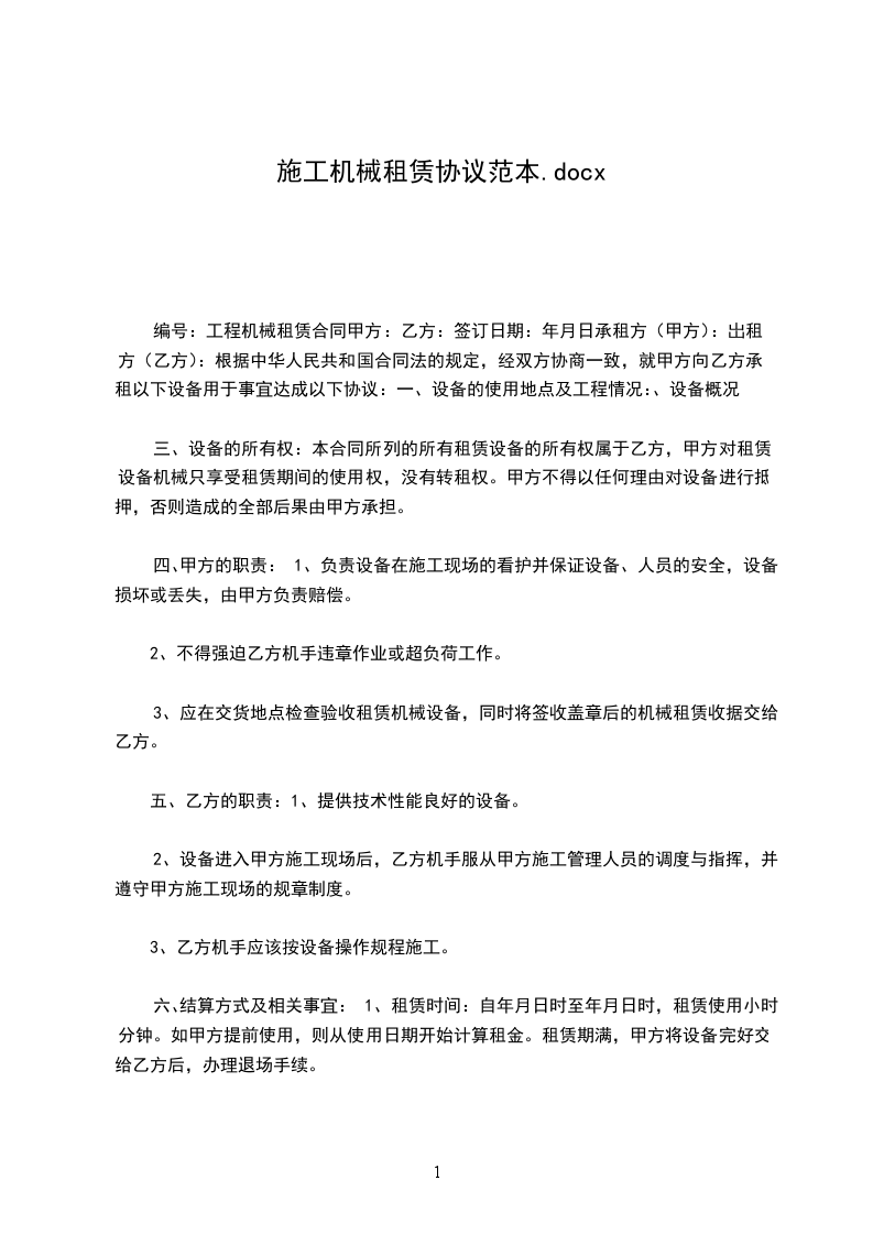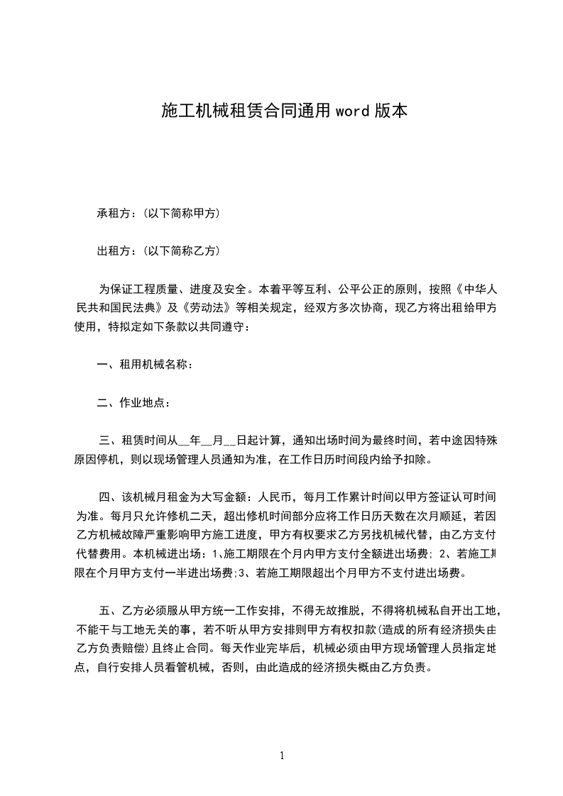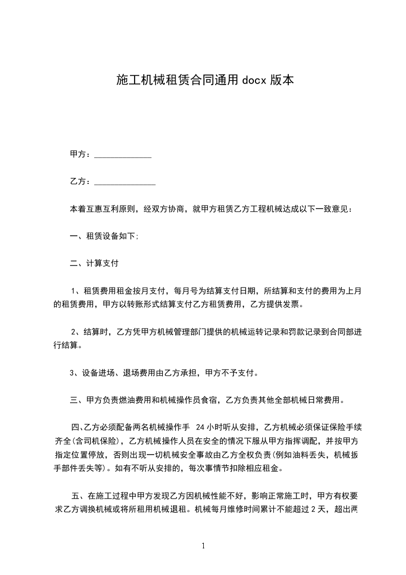五、在施工过程中甲方发现乙方因机械性能不好,影响正常施工时,甲方有权要求乙方调换机械或将所租用机械退租。机械每月维修时间累计不能超过2天,超出两天扣除超出天数租金。六、因地震、降雨、灾害天气造成停工三天以上,甲方按天扣除租赁费用。
