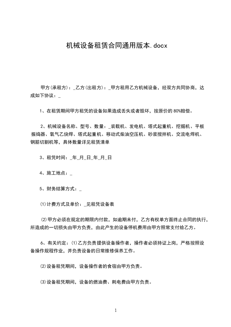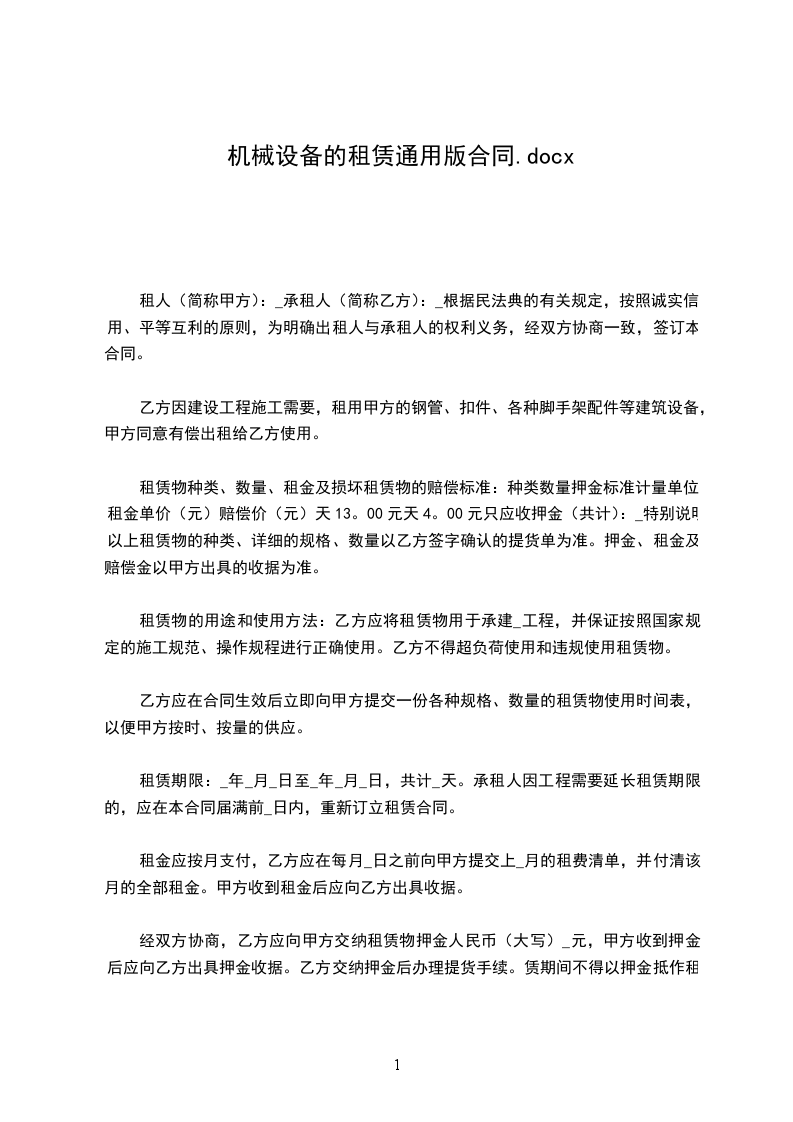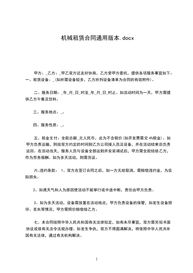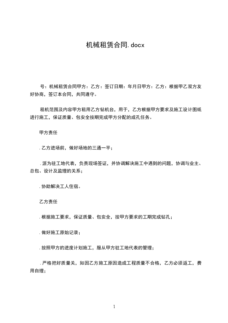 五、在施工过程中甲方发现乙方因机械性能不好,影响正常施工时,甲方有权要求乙方调换机械或将所租用机械退租。机械每月维修时间累计不能超过2天,超出两天扣除超出天数租金。六、因地震、降雨、灾害天气造成停工三天以上,甲方按天扣除租赁费用。