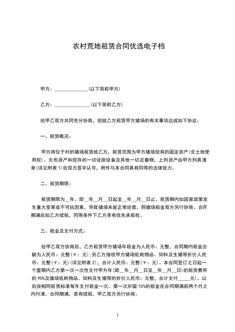 租赁期限为__年。即__年__月__日起至__年__月__日止。租赁期内如国家政策发生重大变革或不可抗因素,导致猪场未能正常经营,则猪场租金双方另行协商。合同期满后如乙方续租,同等条件下乙方享有优先承租权。