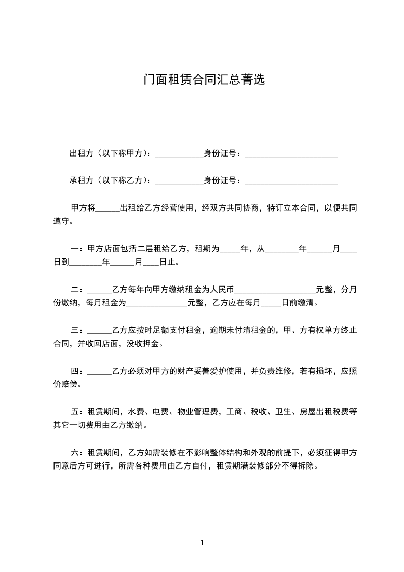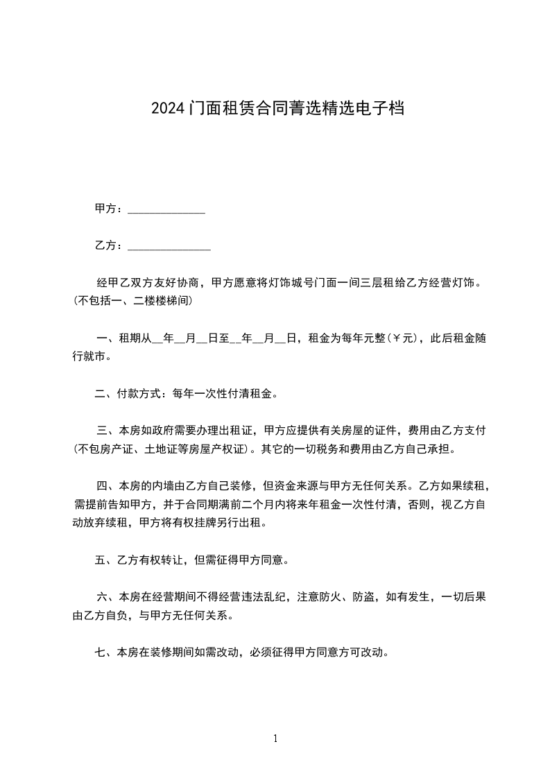 一:甲方店面包括二层租给乙方,租期为_____年,从________年______月____日到________年______月____日止。
