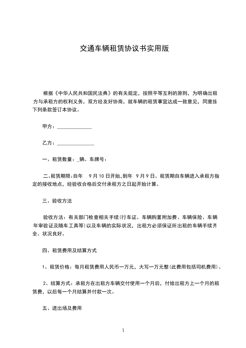 四、租金及结算方式:每天的租车费用为__________元,从租车之日算起,半年结算一次。