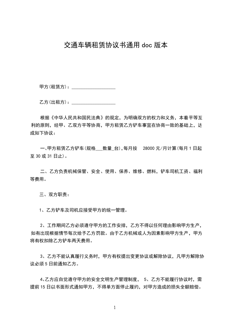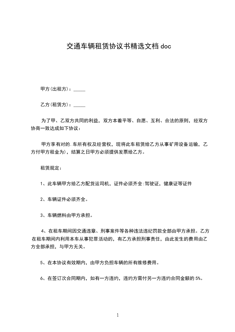 出租方根据承租方需要,同意将车(牌号)租给承租方使用,经双方协商签订如下条款: