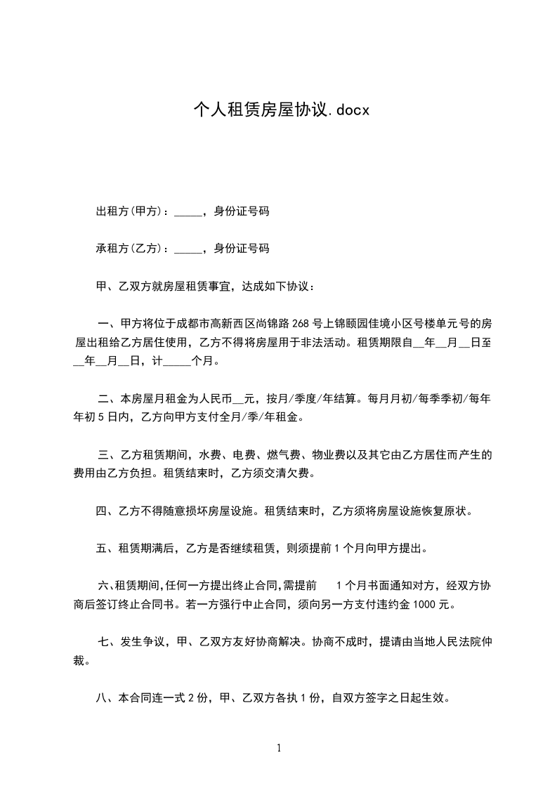 一、甲方将位于成都市高新西区尚锦路268号上锦颐园佳境小区号楼单元号的房屋出租给乙方居住使用,乙方不得将房屋用于非法活动。租赁期限自__年__月__日至__年__月__日,计_____个月。