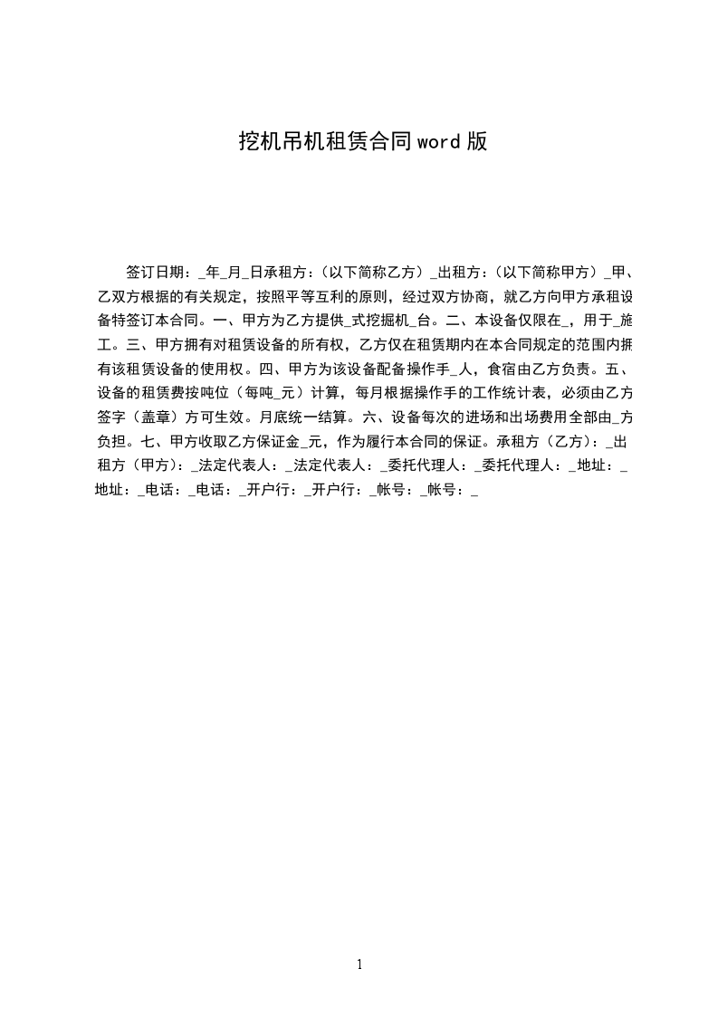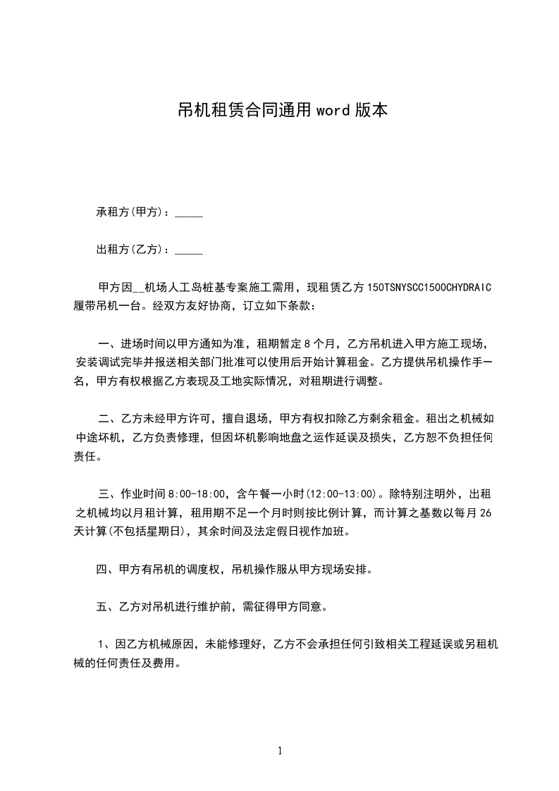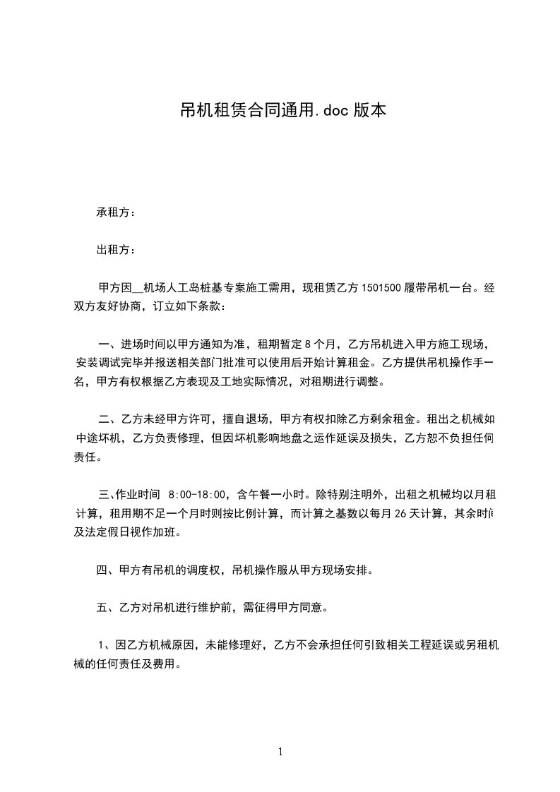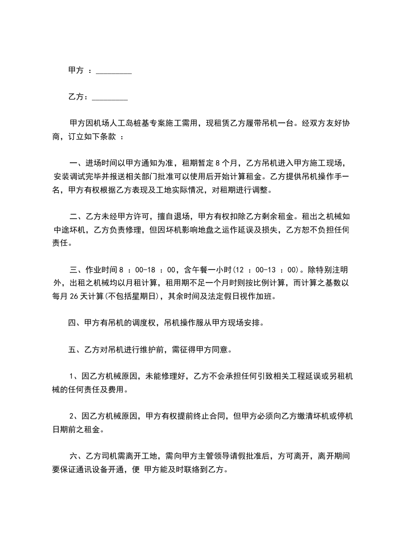 甲方因_________施工需用,现租赁乙方__________________履带吊机一台。经双方友好协商,订立如下条款: