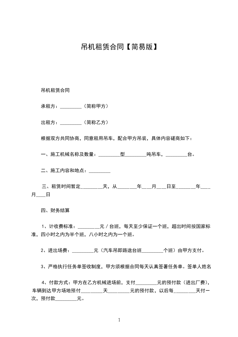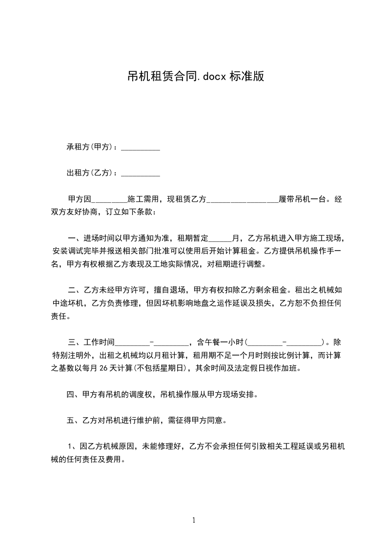 一、进场时间以甲方通知为准,租期暂定______月,乙方吊机进入甲方施工现场,安装调试完毕并报送相关部门批准可以使用后开始计算租金。乙方提供吊机操作手一名,甲方有权根据乙方表现及工地实际情况,对租期进行调整。