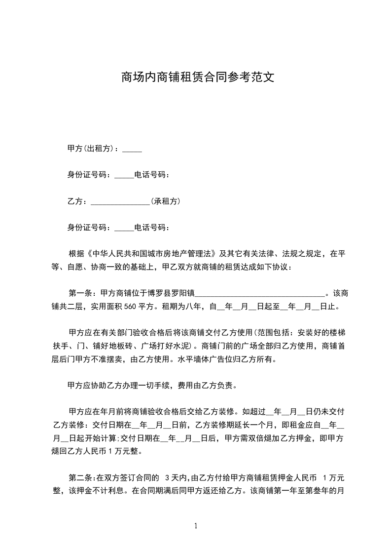 第一条:甲方商铺位于博罗县罗阳镇_________________________________。该商铺共二层,实用面积560平方。租期为八年,自__年__月__日起至__年__月__日止。