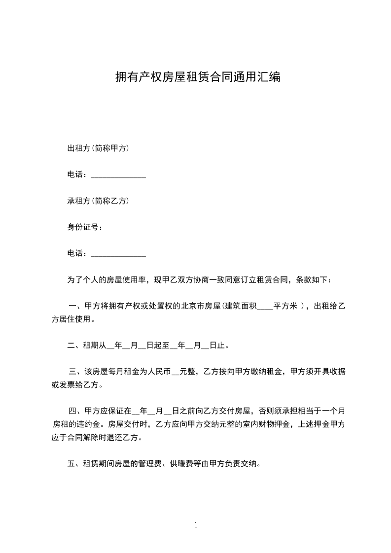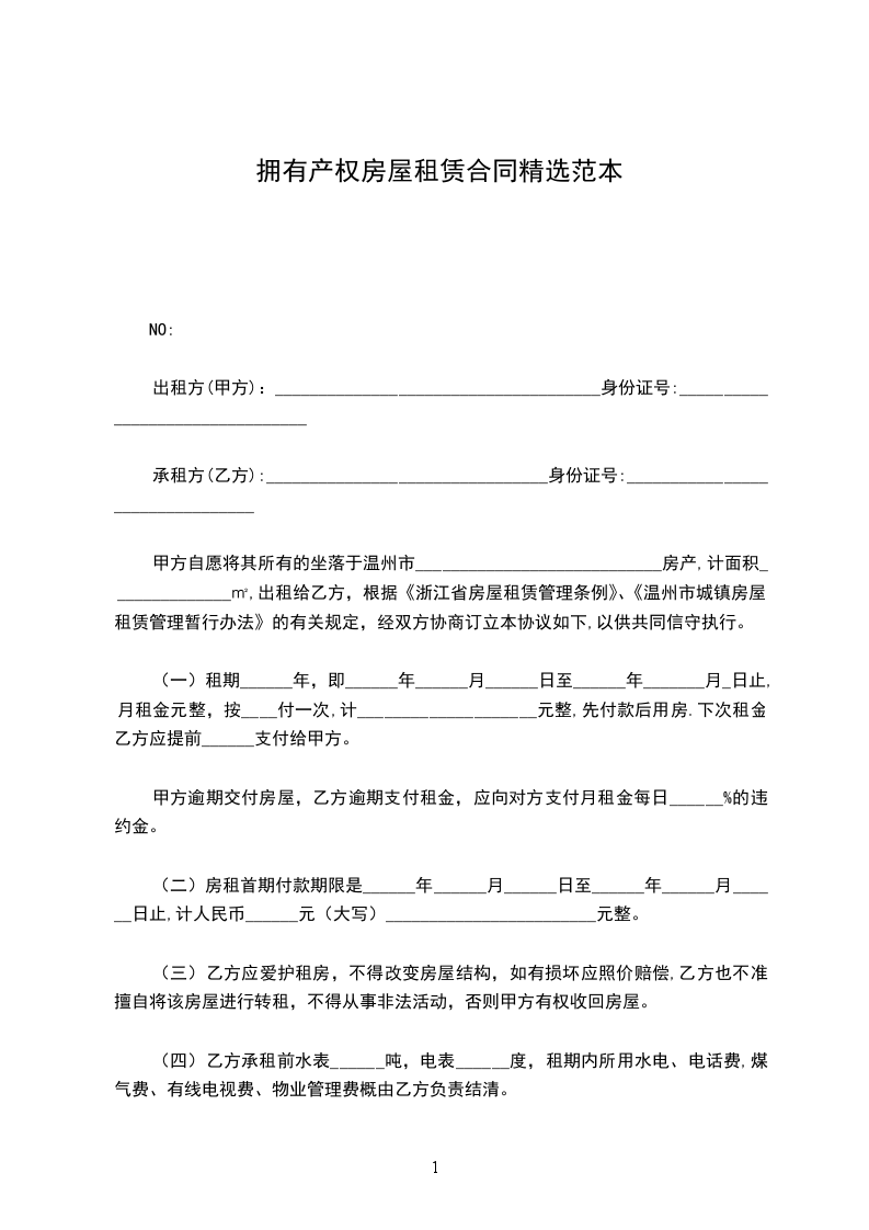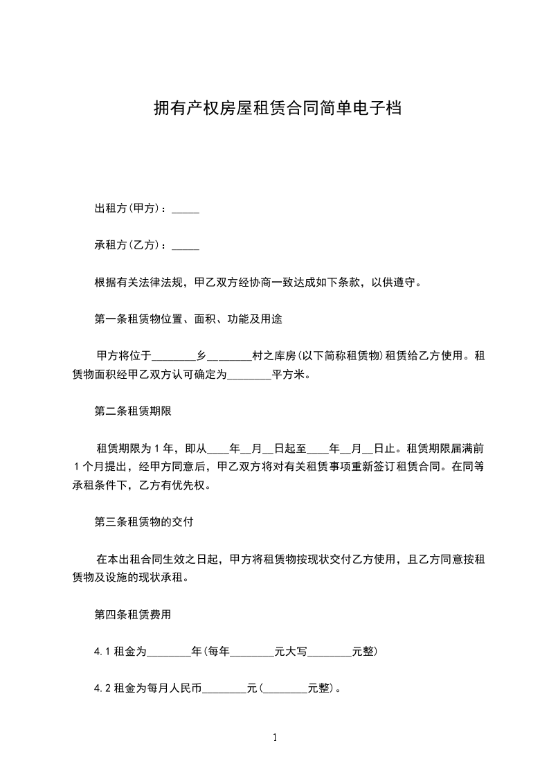 三、该房屋租赁期__年__月__日起至__年__月__日止,为期。租赁期满若甲方继续出租,同等条件下乙方享有优先续租权。如租赁期满乙方不再续租,则乙方应提前一个月告知甲方,并如期将房屋归还并付清相关费用。本合同终止时,甲方对室内设施进行清点,如有短缺,则可据实自行向乙方索赔。
