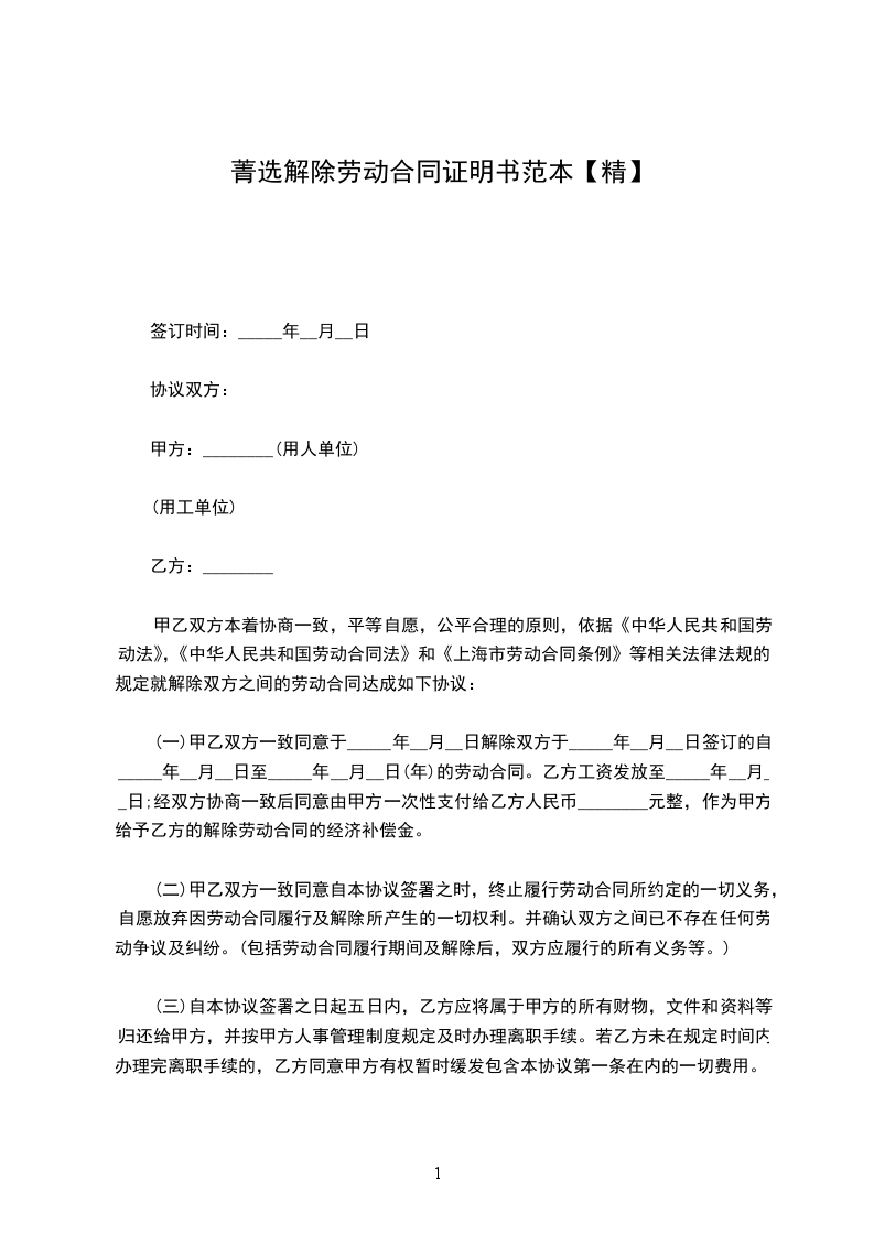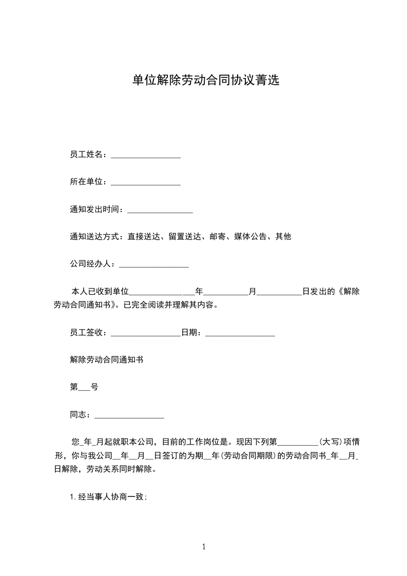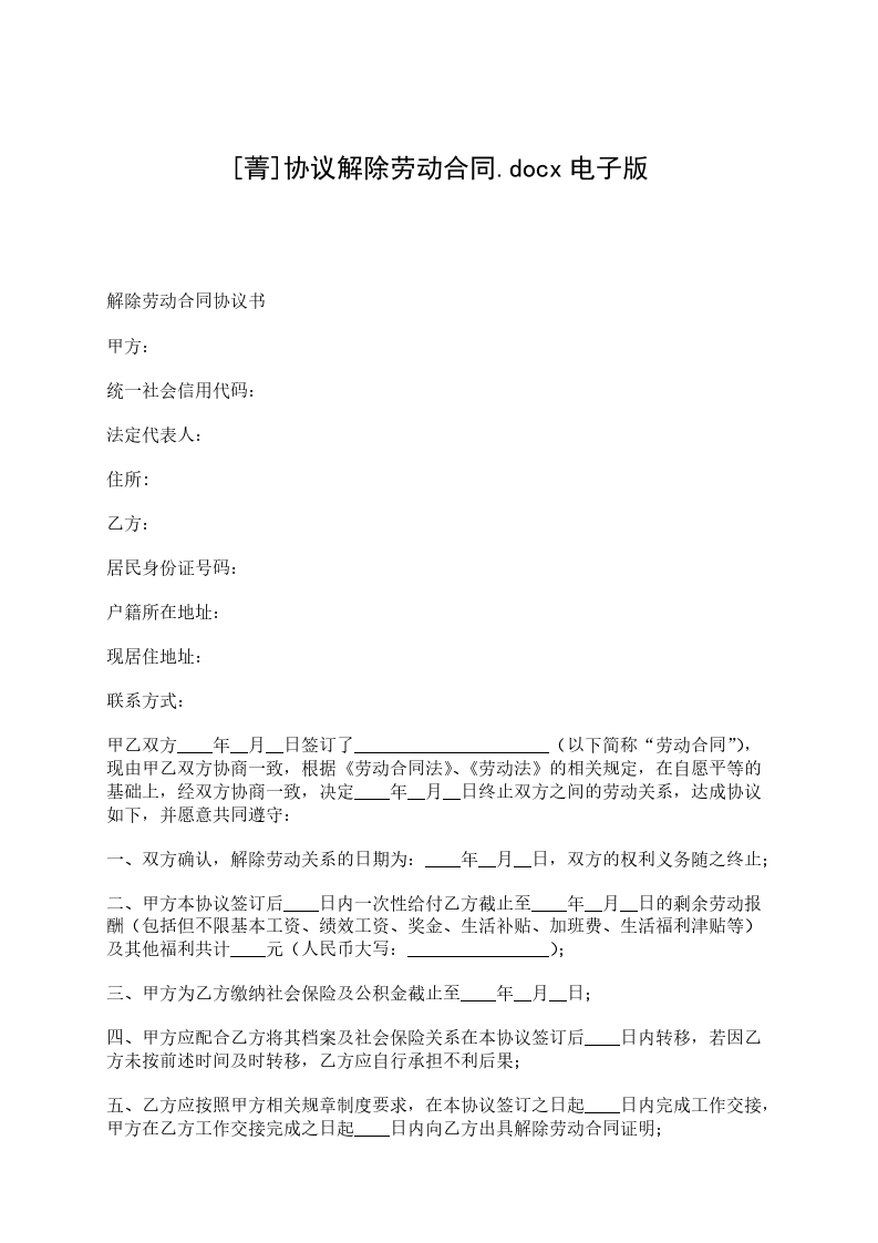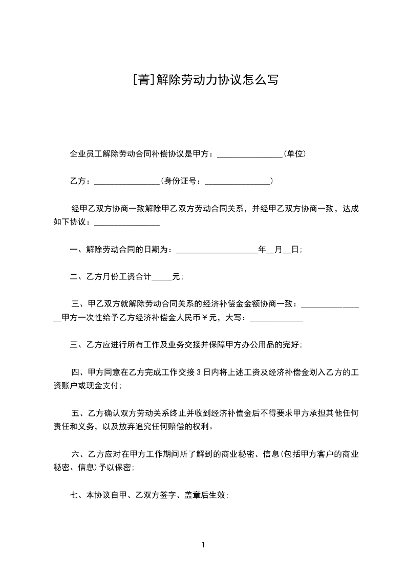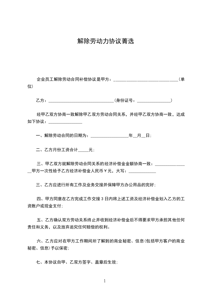 经甲乙双方协商一致解除甲乙双方劳动合同关系,并经甲乙双方协商一致,达成如下协议:________________