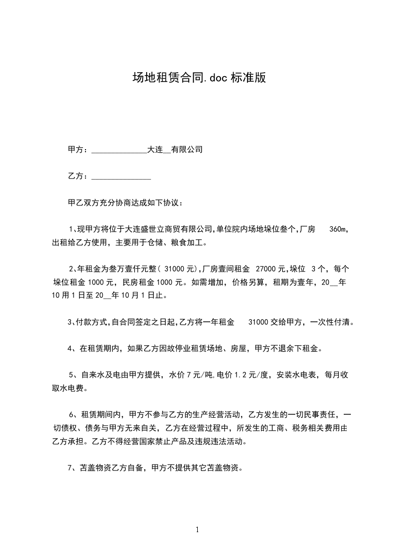 第一条甲方将座落于_________市_________大厦_________室房屋出租乙方使用。建筑面积共计_________平方米。