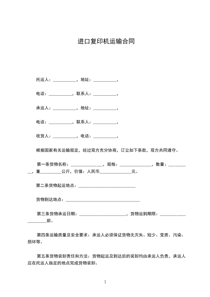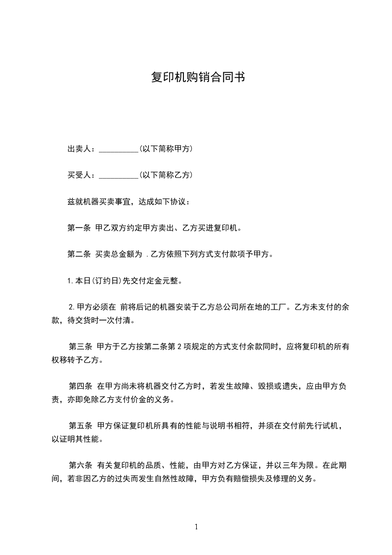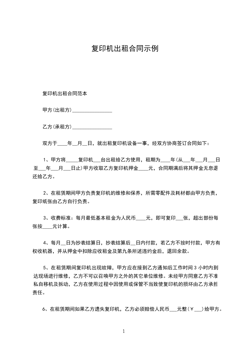 1、甲方将_____复印机___台出租给乙方使用,租期为____年(从___年___月___日至___年___月___日止)甲方收取乙方复印机押金____元,合同期满后将其押金无息退还给乙方。