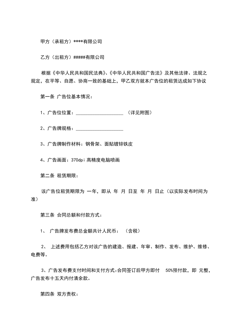 根据《中华人民共和国民法典》、《中华人民共和国广告法》及其他法律、法规之规定,在平等、自愿、协商一致的基础上,甲乙双方就本广告位的租赁达成如下协议: