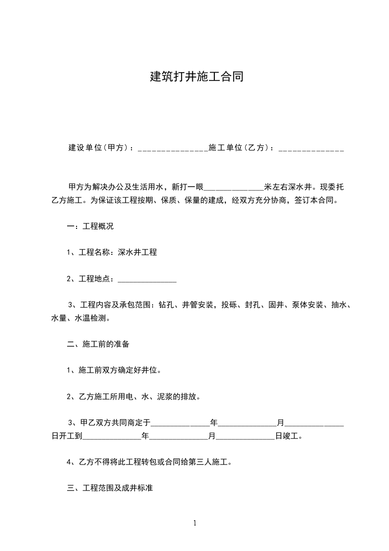 甲方为解决办公及生活用水,新打一眼_______________米左右深水井。现委托乙方施工。为保证该工程按期、保质、保量的建成,经双方充分协商,签订本合同。