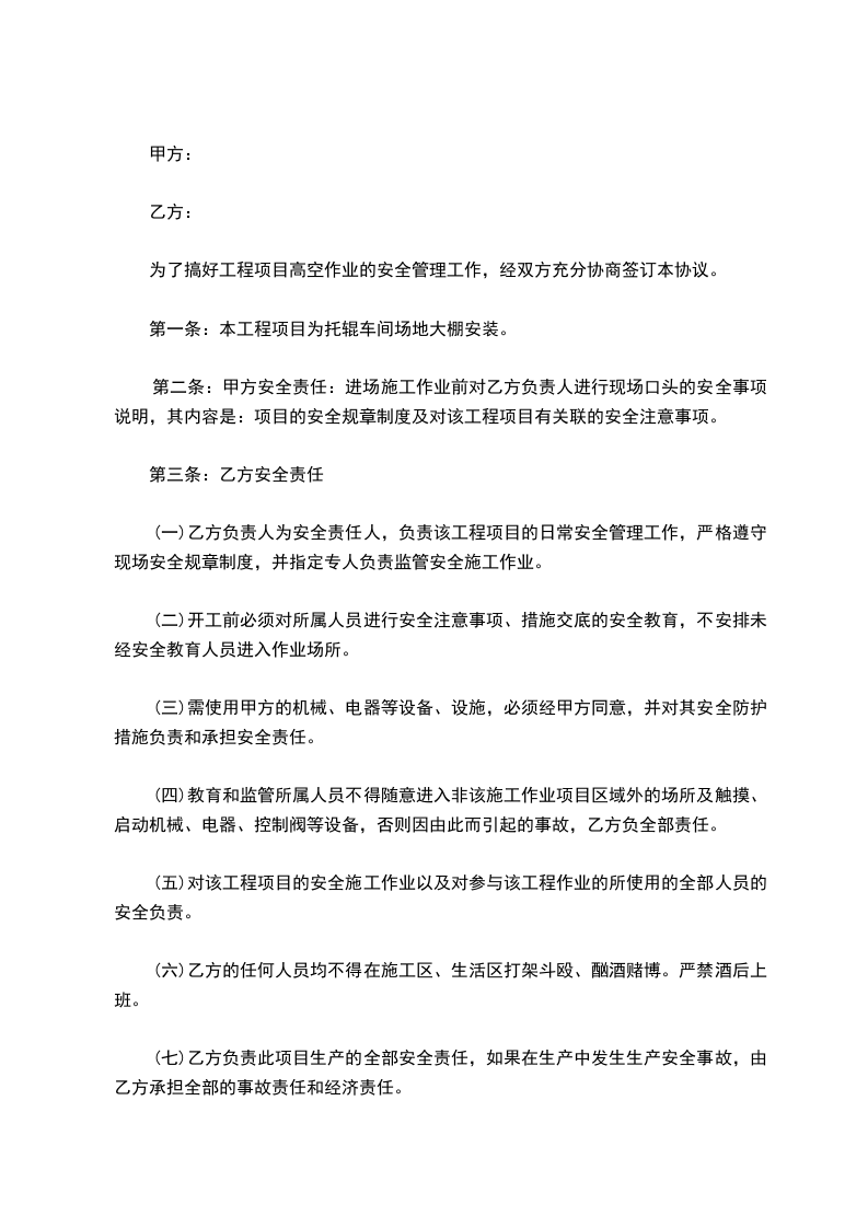 为了搞好工程项目高空作业的安全管理工作,经双方充分协商签订本协议。