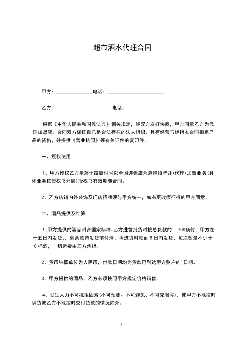 1.甲方确认乙方作为____________________地区薜府酒总经销(买断经营总经销)。