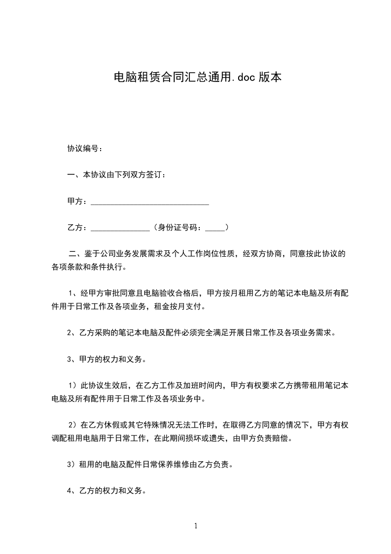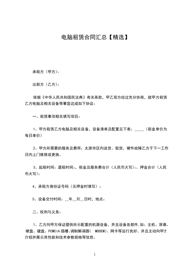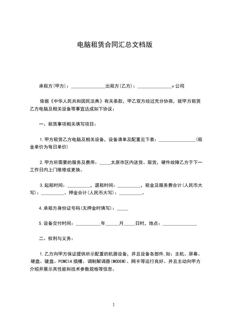 依据《中华人民共和国民法典》有关条款,甲乙双方经过充分协商,就甲方租赁乙方电脑及相关设备等事宜达成如下协议: