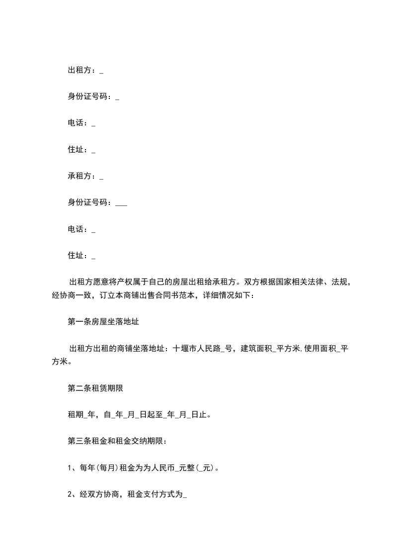 出租方出租的商铺坐落地址:十堰市人民路_号,建筑面积_平方米,使用面积_平方米。