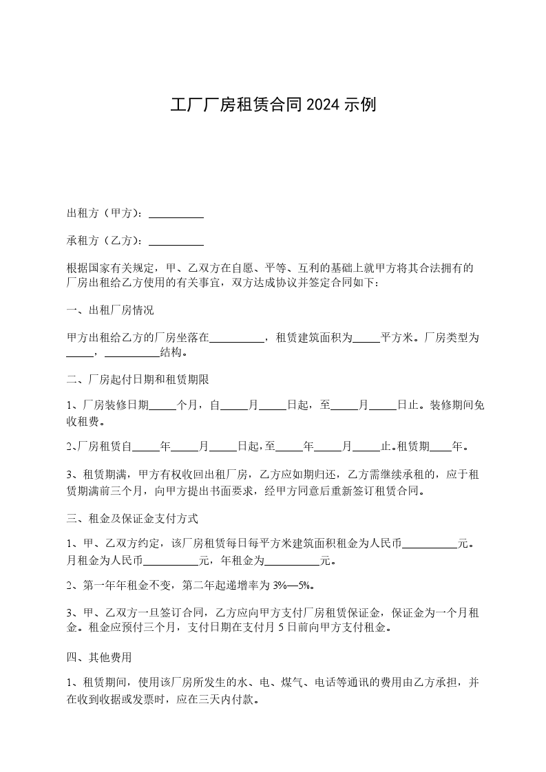3、甲、乙双方一旦签订合同,乙方应向甲方支付厂房租赁保证金,保证金为一个月租金。租金应预付三个月,支付日期在支付月5日前向甲方支付租金。