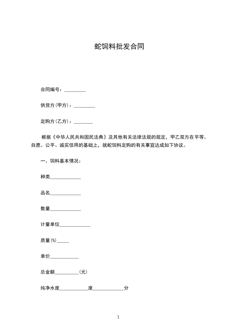根据《中华人民共和国民法典》及其他有关法律法规的规定,甲乙双方在平等、自愿、公平、诚实信用的基础上,就蛇饲料定购的有关事宜达成如下协议。