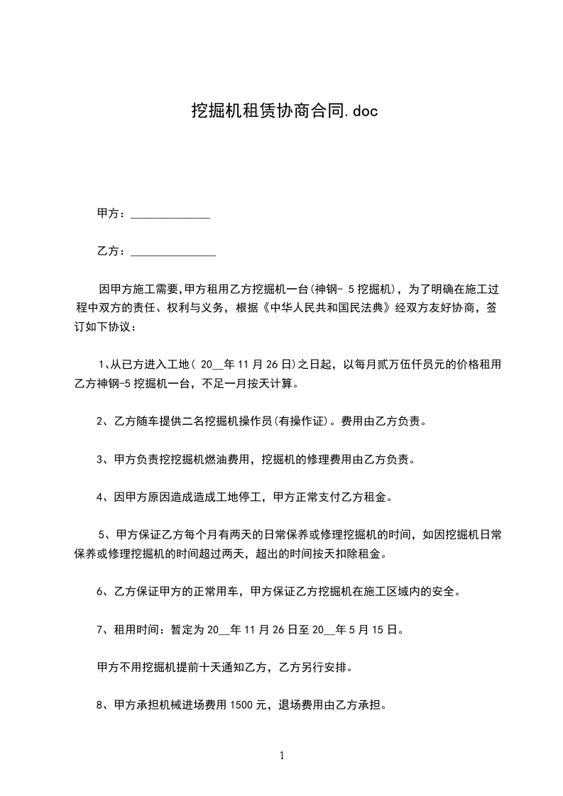 1、从已方进入工地(20__年11月26日)之日起,以每月贰万伍仟员元的价格租用乙方神钢-5挖掘机一台,不足一月按天计算。