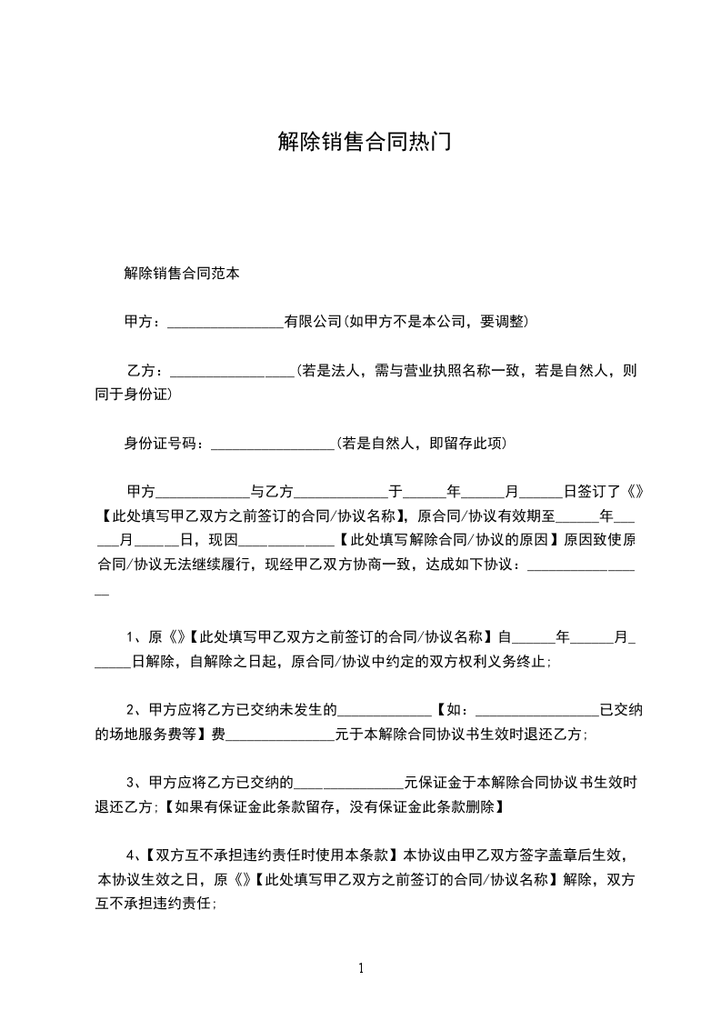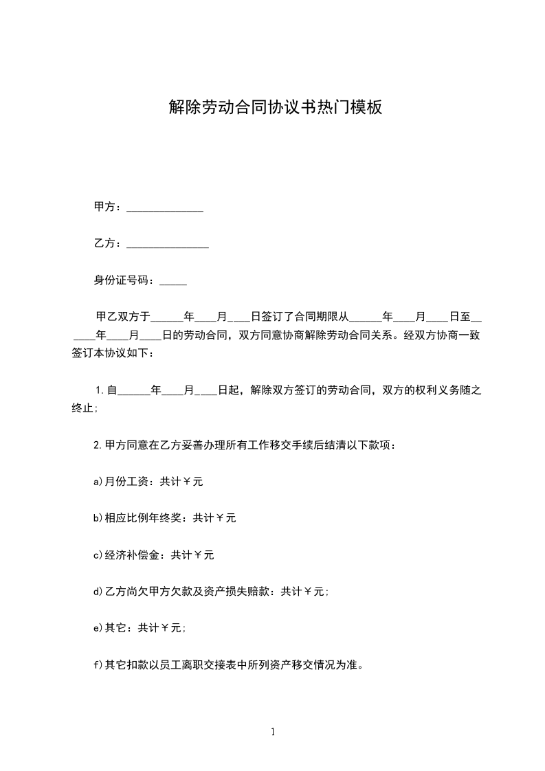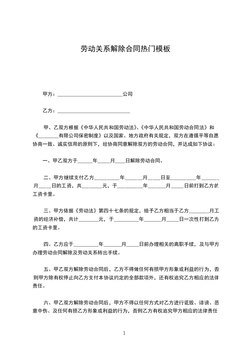 1.自______年____月____日起,解除双方签订的劳动合同,双方的权利义务随之终止;