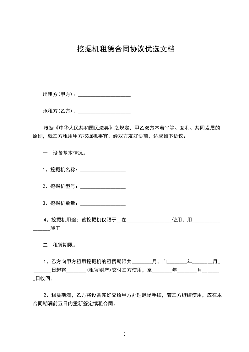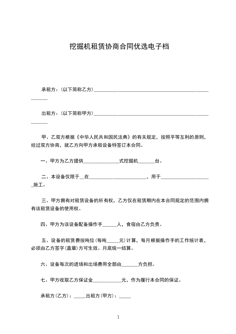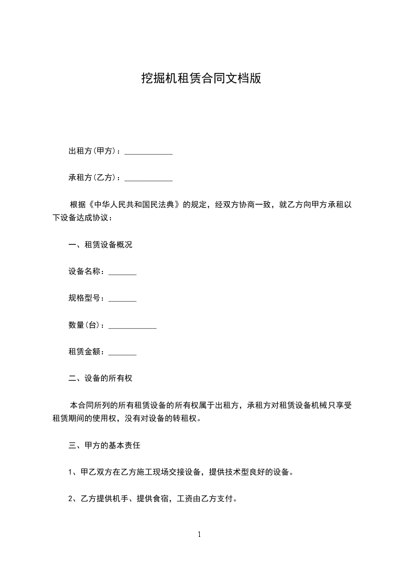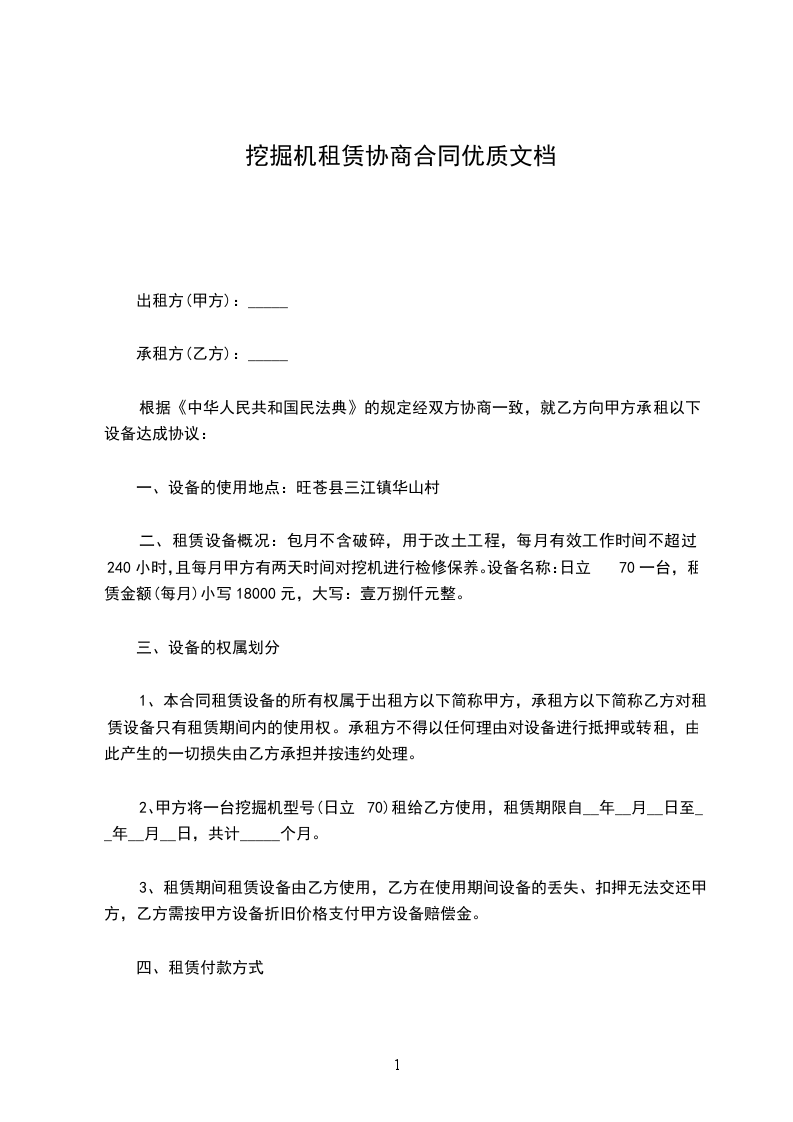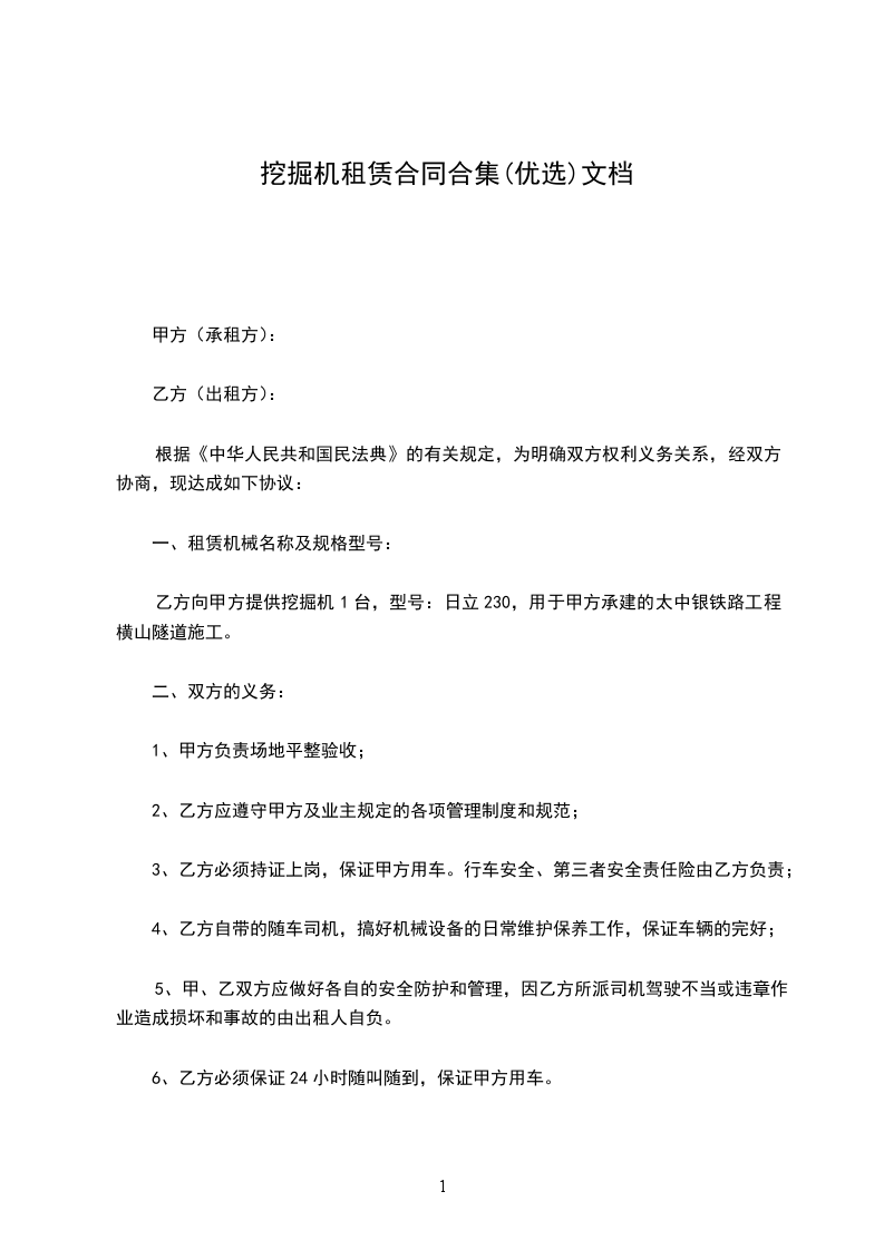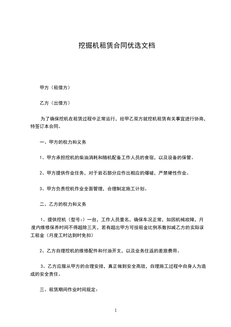 1、提供挖机(型号:)一台,工作人员壹名,确保车况正常,如因机械故障,月度内维修保养时间不得超除三天,若有超出甲方可按租金比例系数扣减乙方的实际误工租金(月度工时达到时免扣)
