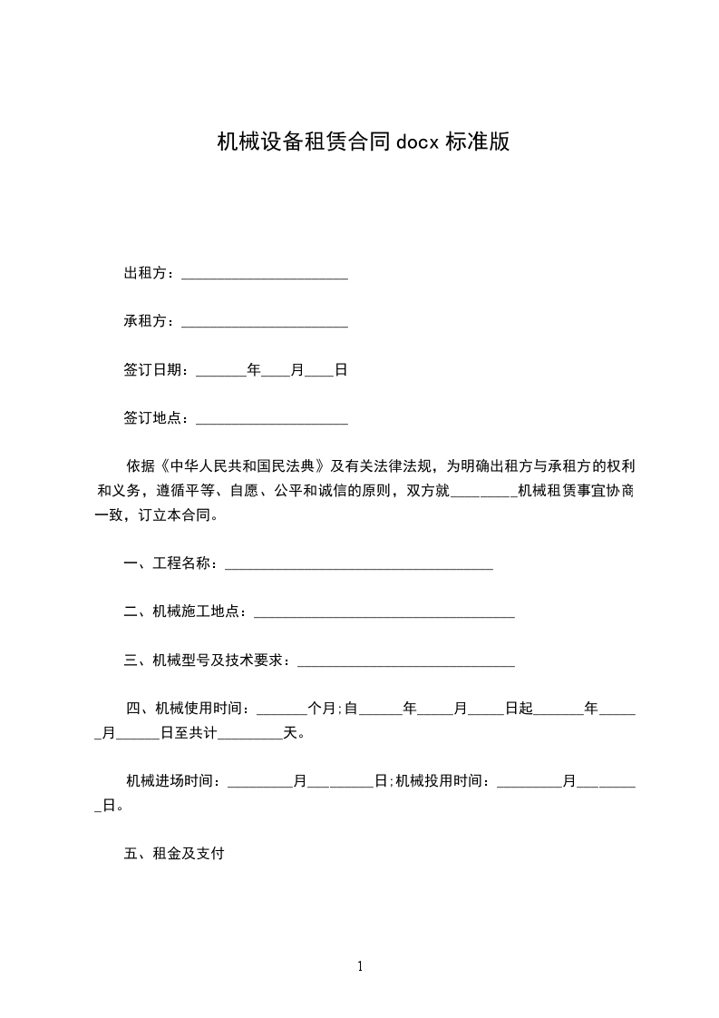依据《中华人民共和国民法典》及有关法律法规,为明确出租方与承租方的权利和义务,遵循平等、自愿、公平和诚信的原则,双方就_________机械租赁事宜协商一致,订立本合同。