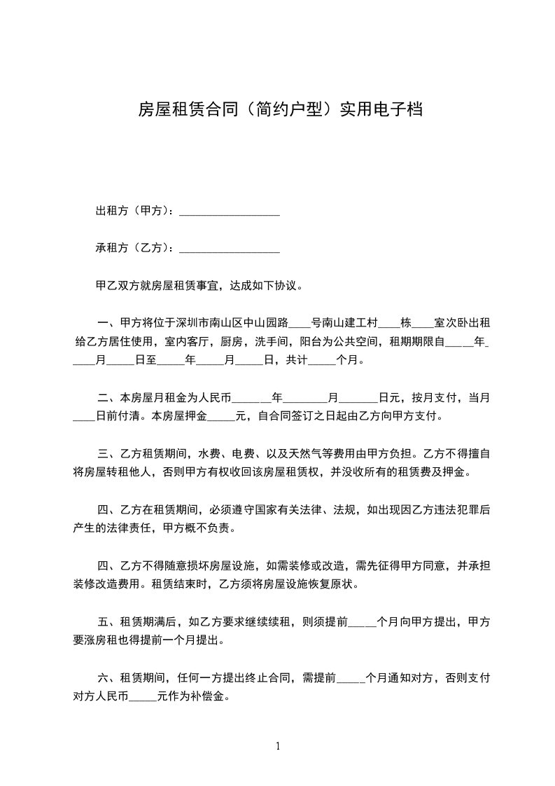 一、甲方将位于深圳市南山区中山园路____号南山建工村____栋____室次卧出租给乙方居住使用,室内客厅,厨房,洗手间,阳台为公共空间,租期期限自_____年_____月_____日至_____年_____月_____日,共计_____个月。