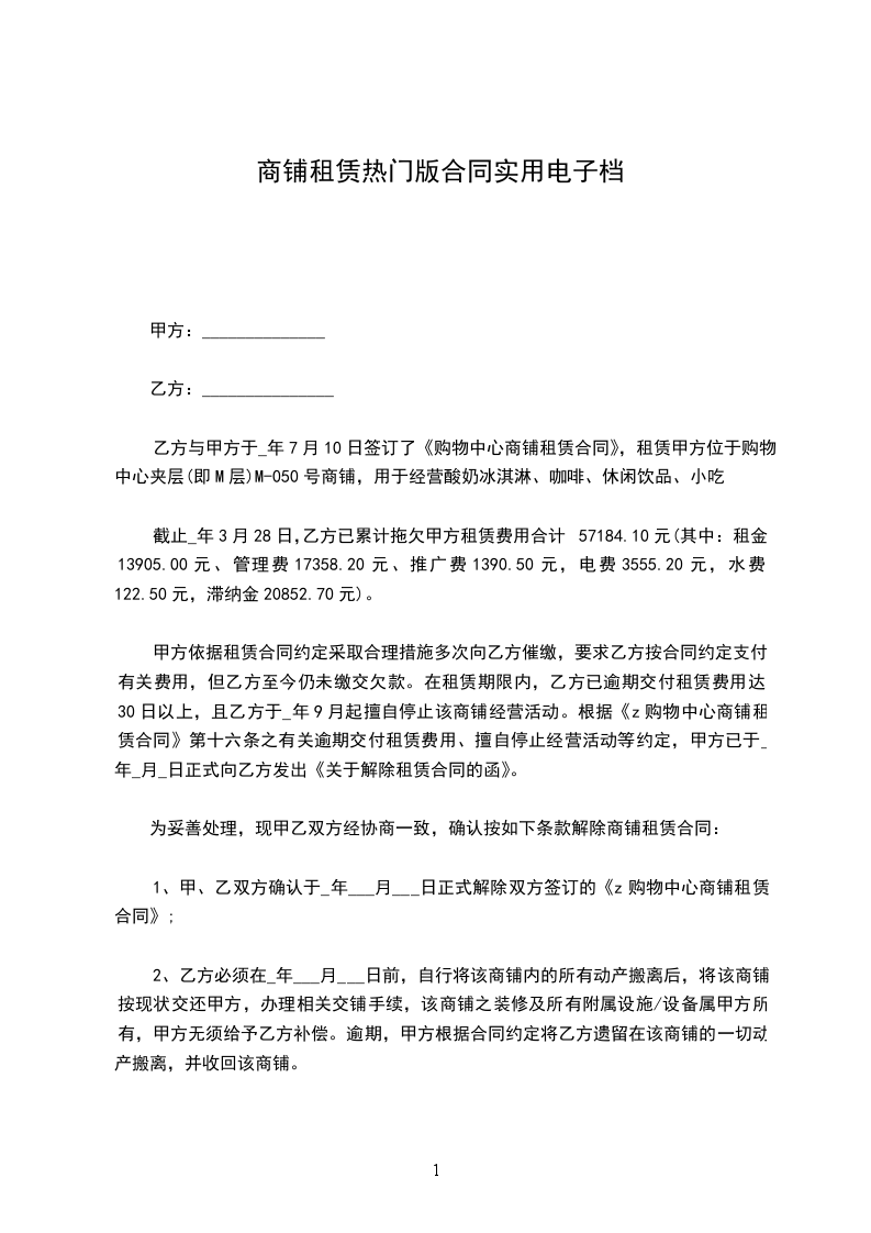 合同自行终止,双方同意终止或解除时,一方应在三日内与甲方结清有关费用,办理退还商铺的移交手续。