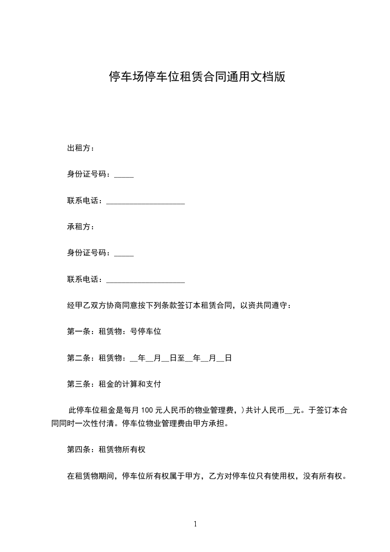 此停车位租金是每月100元人民币的物业管理费,)共计人民币__元。于签订本合同同时一次性付清。停车位物业管理费由甲方承担。