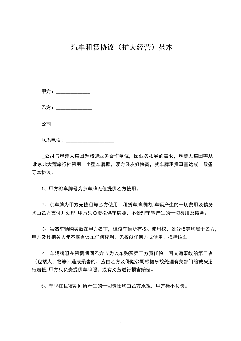 _公司与垦荒人集团为旅游业务合作单位,因业务拓展的需求,垦荒人集团需从北京北大荒旅行社租用一小型车牌照,双方经友好协商,就车牌租赁事宜达成一致签订本协议。