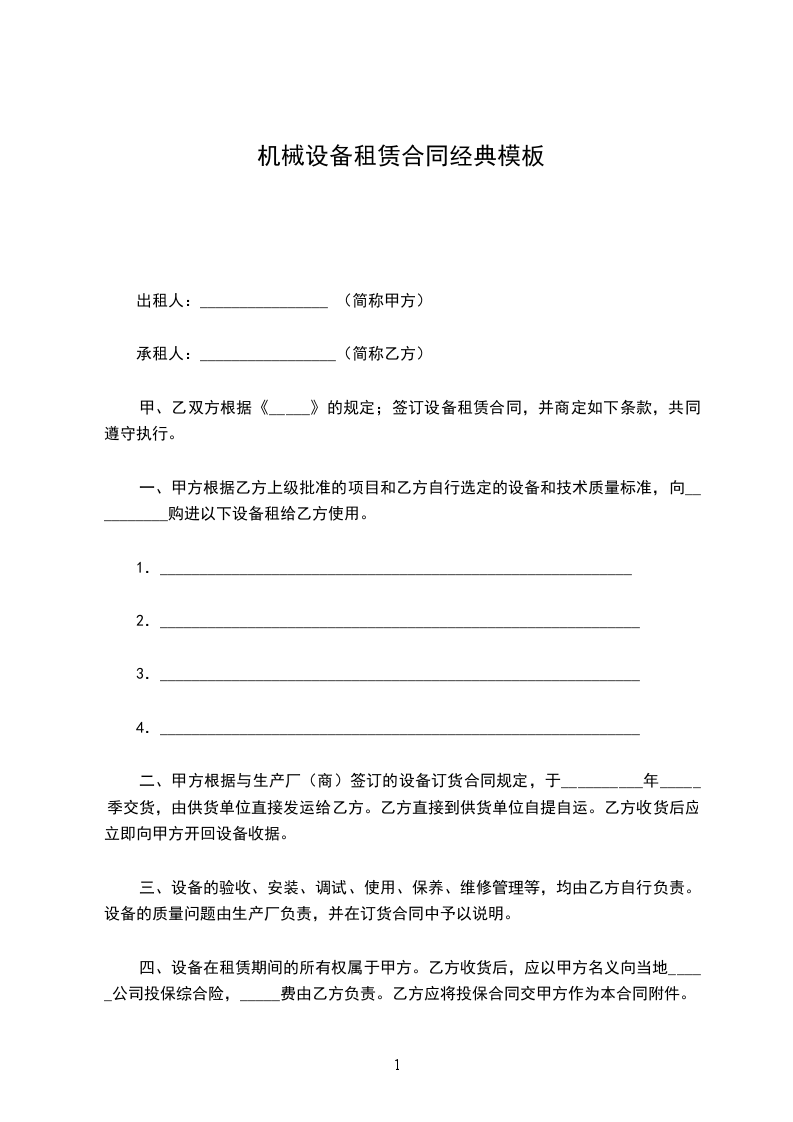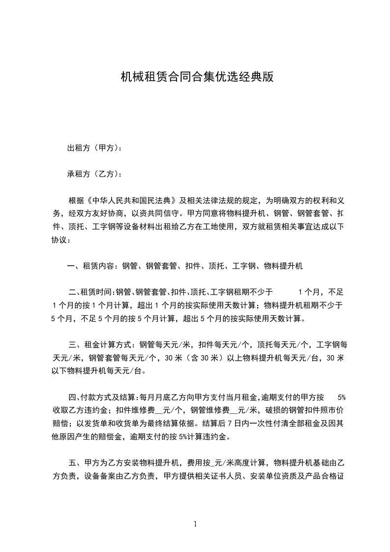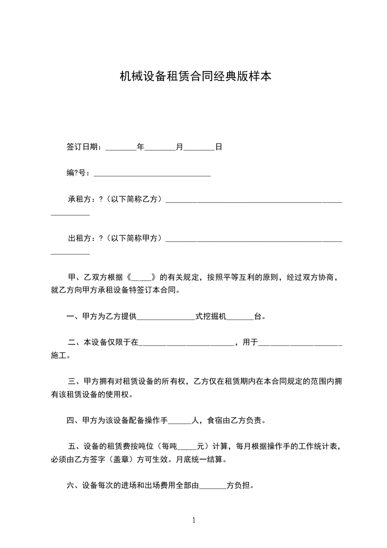 一、为加快施工进度,乙方需要租用甲方机械设备。根据《中华人民共和国民法典》的有关规定,本着平等互利的原则,经甲、乙双方友好协商特签订本合同。