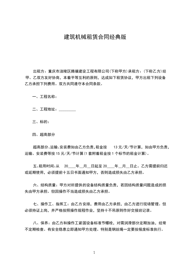 (1)租赁期限:时间个月、不足个月按个月计算;每月租金元,超出每天每台按_元收取。如乙方租赁时间不足合同日期一半时,甲方收乙方70%租金作为补偿金。操作工工资食宿费用由乙方承担。如乙方超出合同约定时间继续租用时应在合同期满前十五日内重新签订续租合同。新设备进场配重予制由乙方负责。