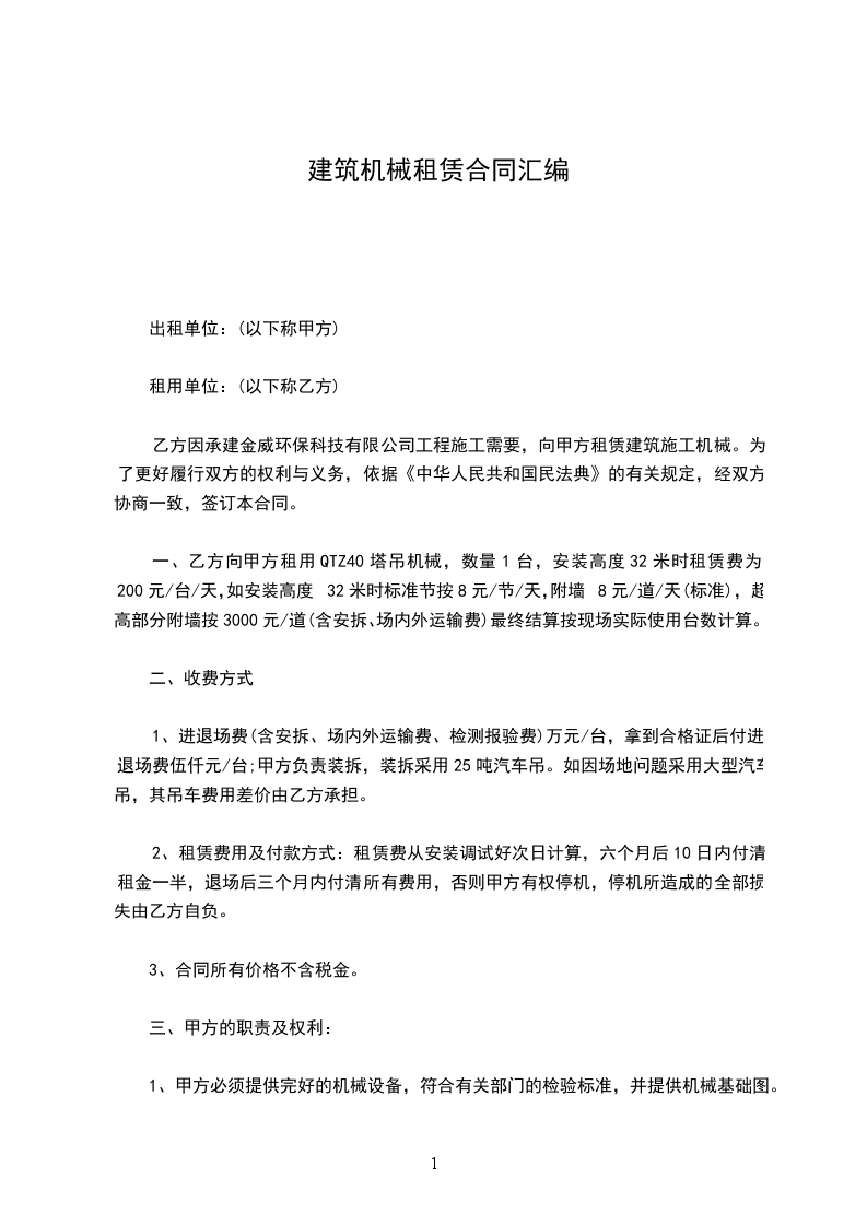 第一条:租赁机械概况
