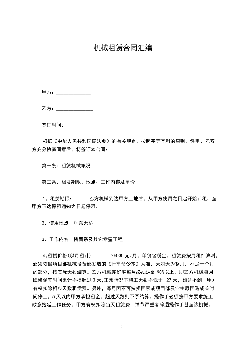 4、租赁价格(以月租计):_____26000元/月,单价含税金。租赁费按月租结算时,必须依据项目部机械设备部发放的《行车命令本》为准,天对天为整月,不足一个月的部分,按实际天数结算。乙方机械完好率每月必须达到90%以上,即乙方机械每月维修保养时间累计不得超过3天,正常情况下施工天数不低于27天,如达不到,甲方有权扣除相应天数租赁费。另外,每月因不可抗拒因素或项目部及业主原因造成长时间停工,5天以内甲方承担租金,超过天数则不予结算。操作手必须按甲方要求施工,故意拖延工作任务,甲方有权扣除当天租赁费,情节严重者辞退操作手甚至该机械。