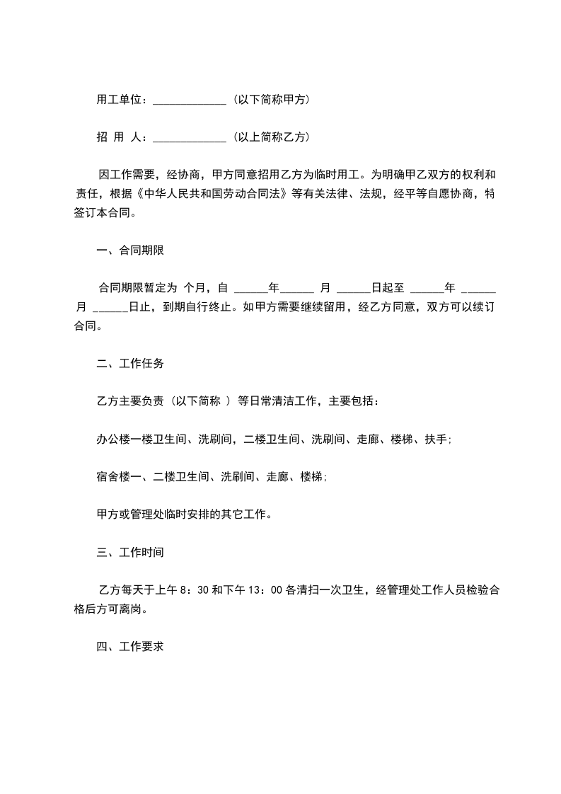 因工作需要,经协商,甲方同意招用乙方为临时用工。为明确甲乙双方的权利和责任,根据《中华人民共和国劳动合同法》等有关法律、法规,经平等自愿协商,特签订本合同。