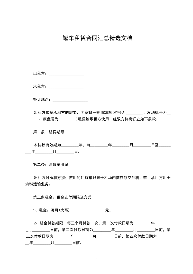 出租方根据承租方的需要,同意将一辆油罐车(型号为_________、发动机号为_________、底盘号为_________)租赁给承租方使用,经双方协商订立如下条款: