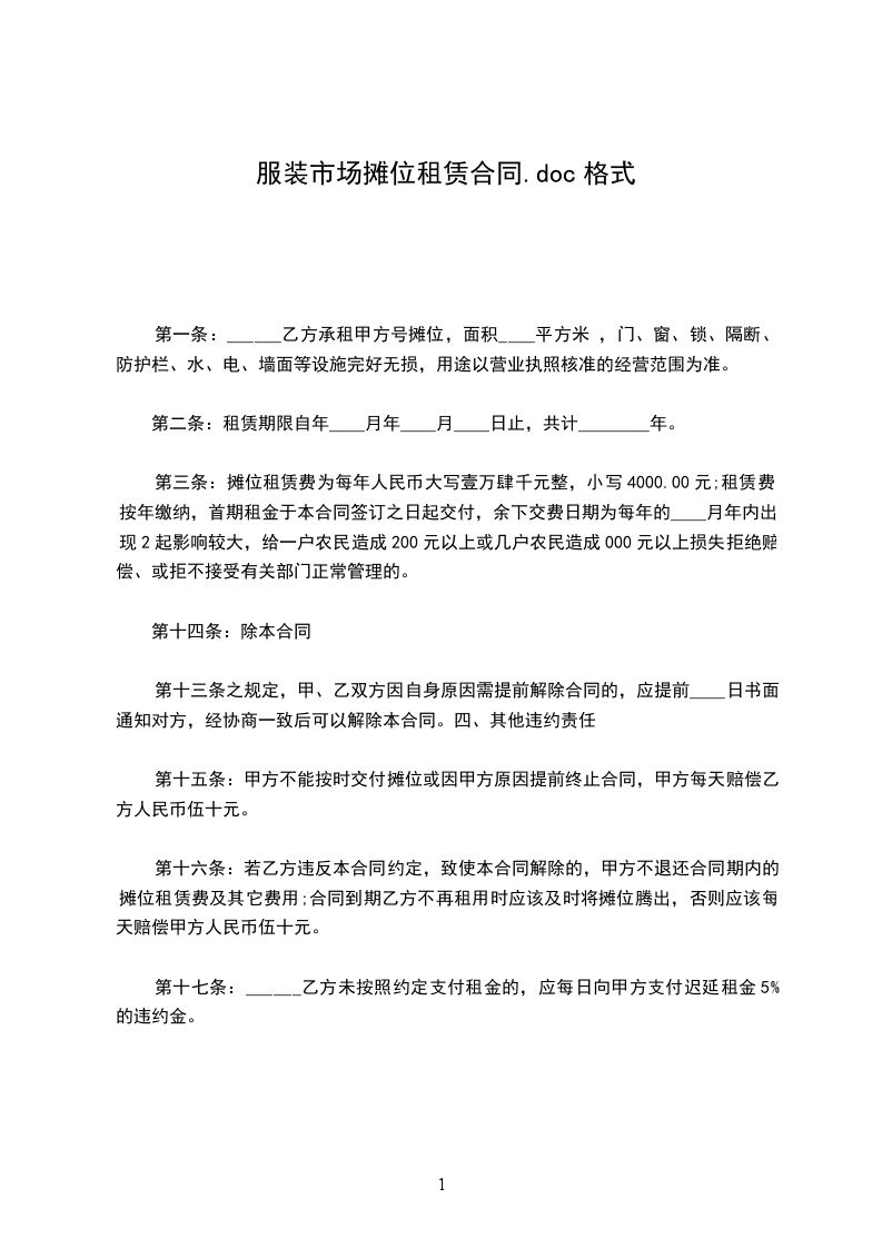 第十五条:甲方不能按时交付摊位或因甲方原因提前终止合同,甲方每天赔偿乙方人民币伍十元。