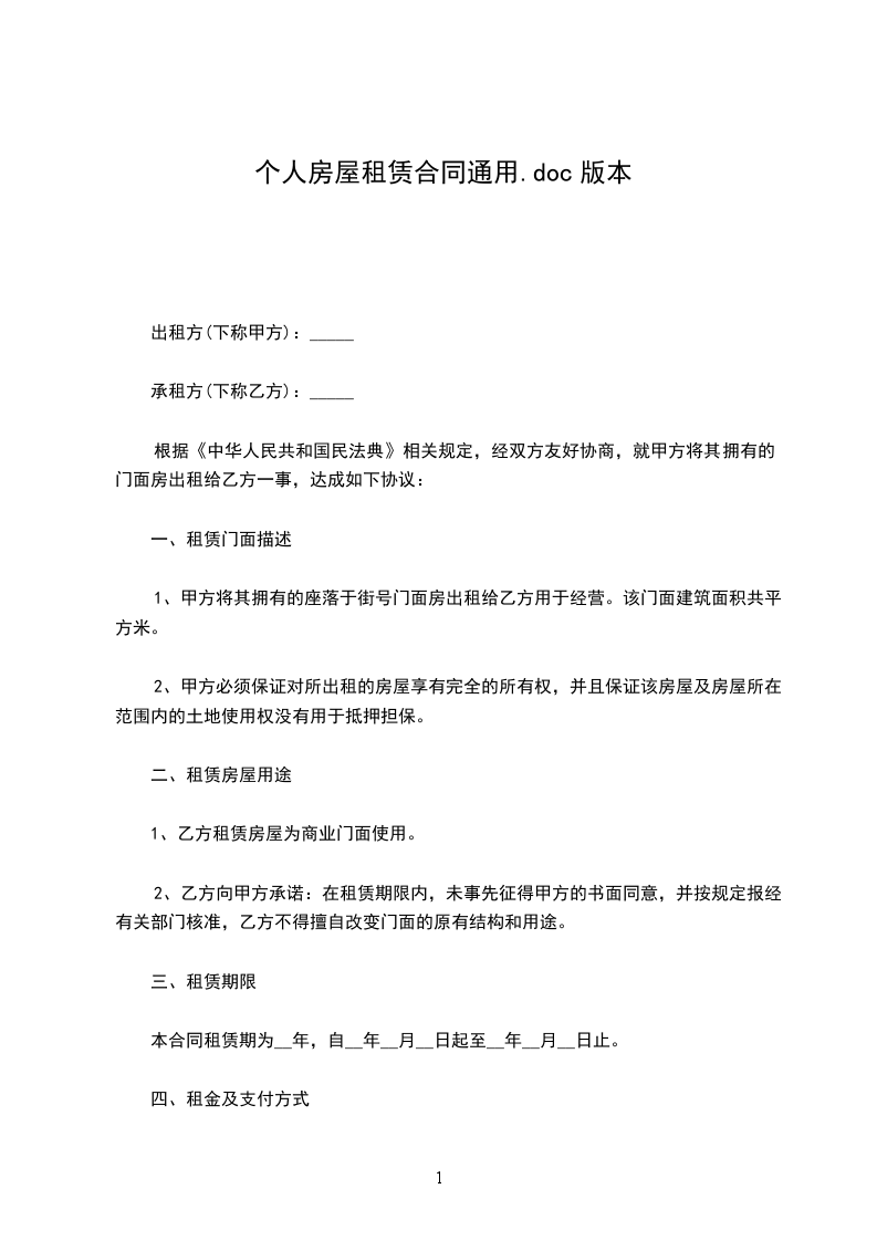 根据《中华人民共和国民法典》相关规定,经双方友好协商,就甲方将其拥有的门面房出租给乙方一事,达成如下协议: