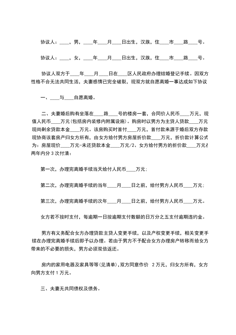 二、夫妻婚后购有坐落在____路____号的楼房一套,合同价人民币____万元,现值人民币____万元(包括房内装修内附属设施)。购房时以男方为主贷人贷款____万元,现尚剩余贷款本金____万元。该房购买时首付____万元,首付款来源于婚后双方存款。现协商该套房产归女方所有,由女方给付男方房屋折价款____万元,折价款计算公式为:房屋现价____万元-未还贷款本金____万元/2、女方给付男方的折价款____万元在两年内分3次付清:
