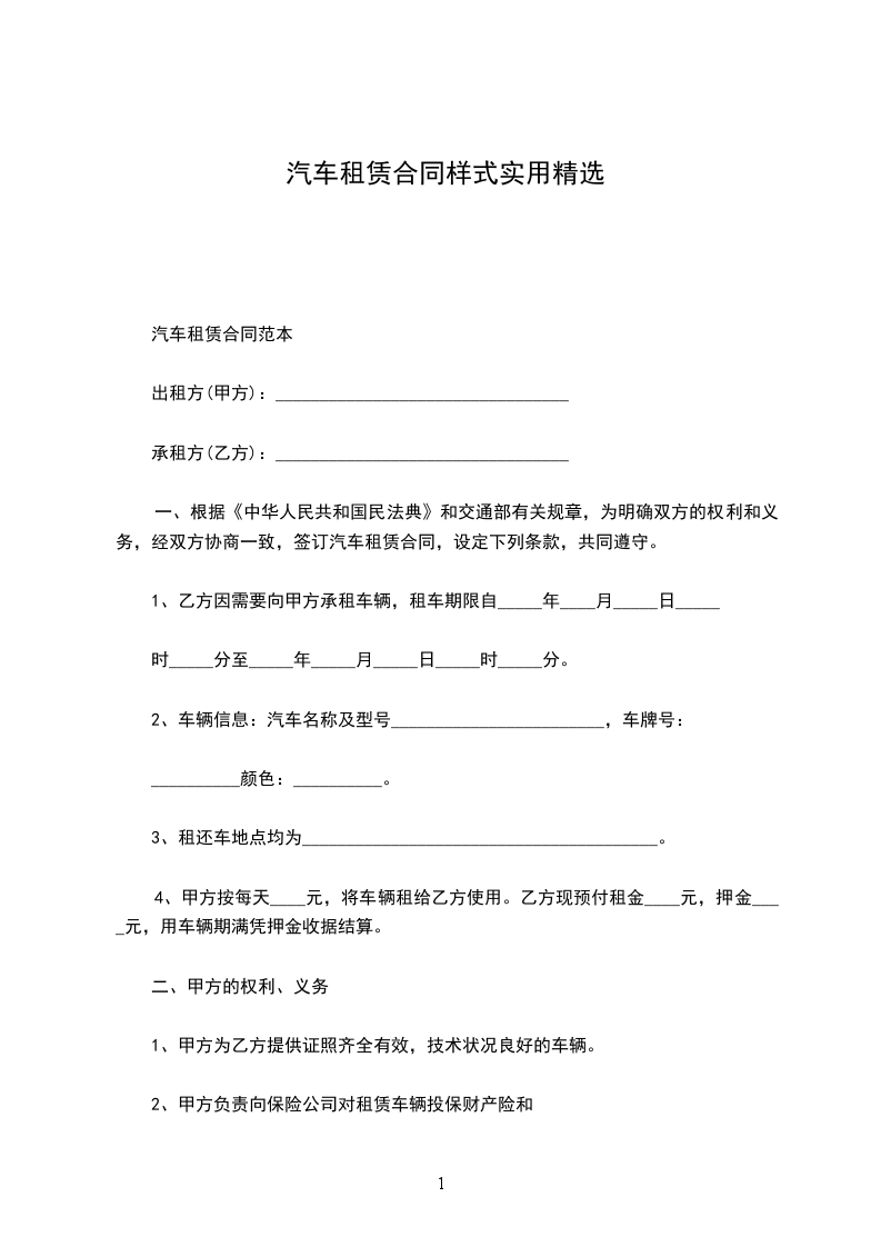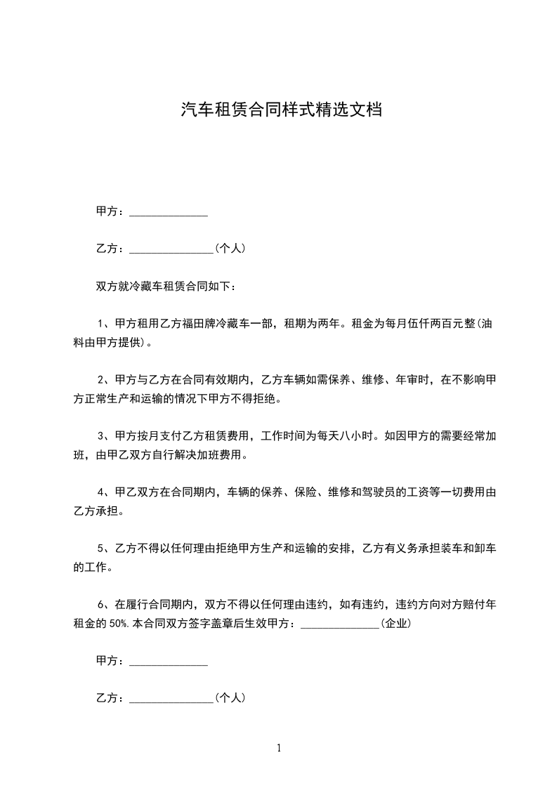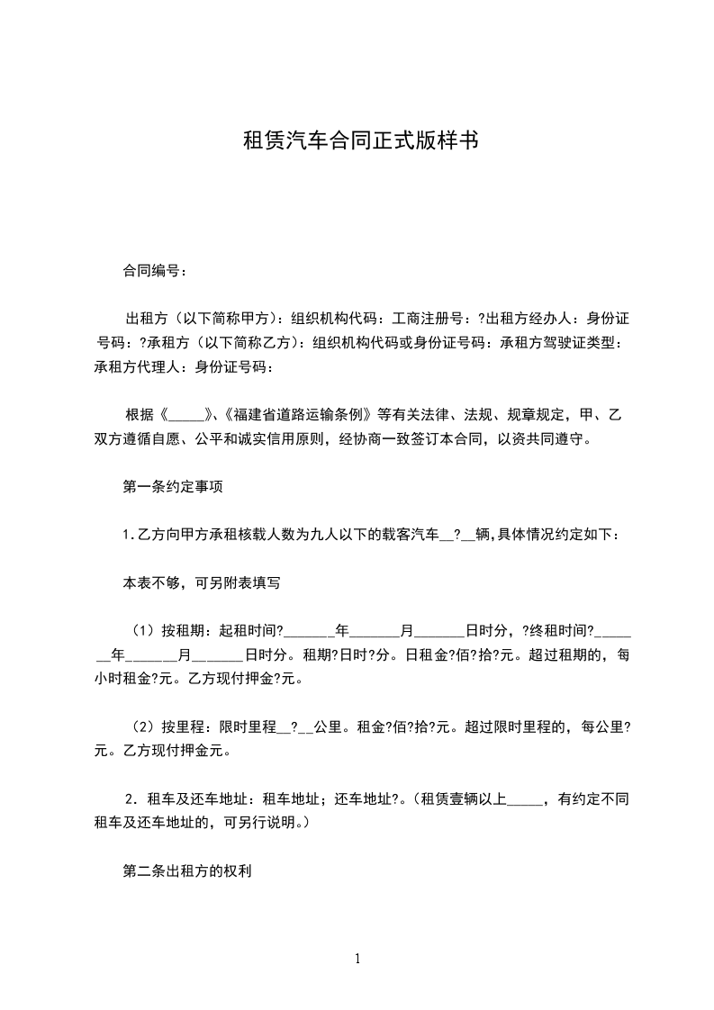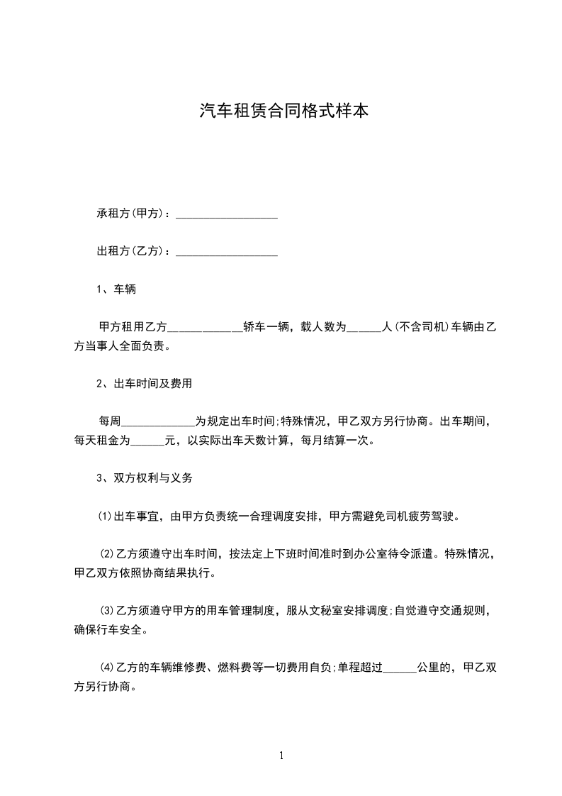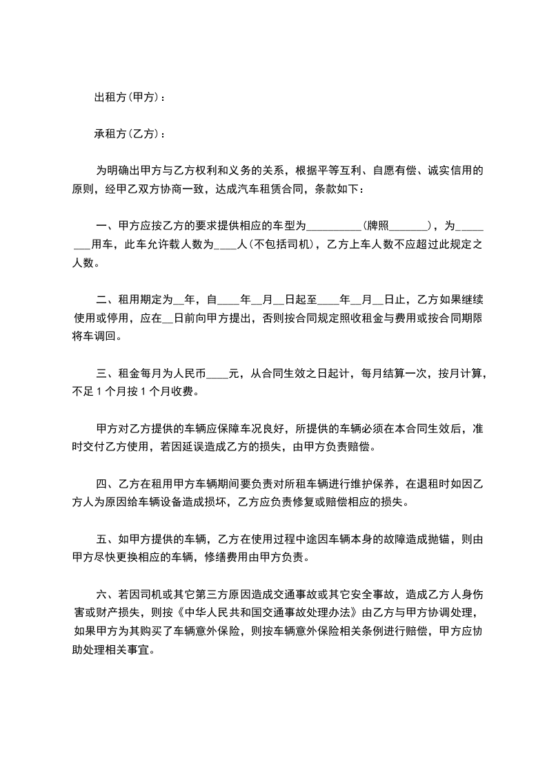 租赁物:________汽车________型(或豪华型)颜色_________车辆号牌________________。租赁合同期限:自_________年_________月_________日至_________年_________月_________日。租赁费用:每月租金人民币________元整(不含汽油费,车辆保养费,驾驶员工资)租车押金一辆:________元整。押金、租金的支付方法:租车租金每月预付结算一次。租车押金一次付清。
